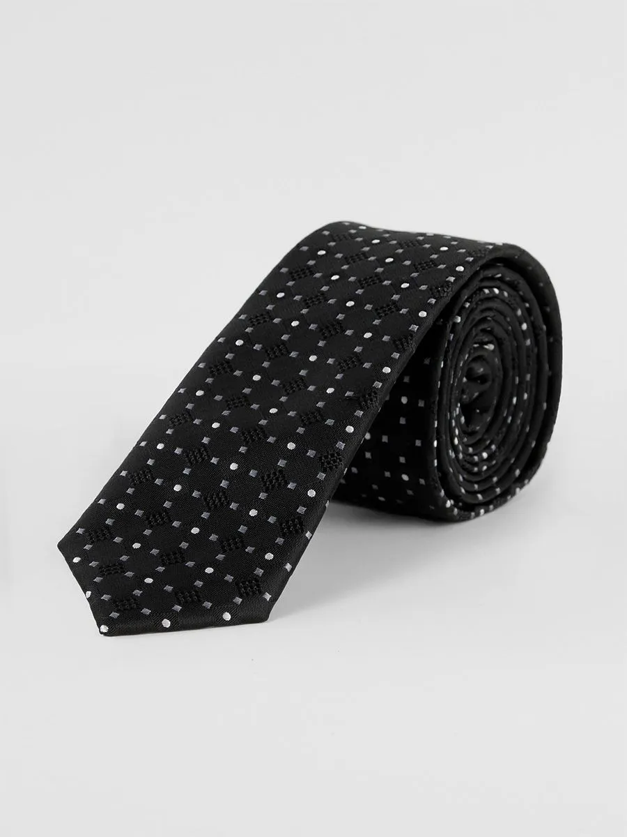 Узкий черный галстук с интересной фактурой в виде точек белого и серого цвета, расположенных в определенной последовательности выполнен из 100% микрофибры, а изнутри имеется подклад. Размер галстука 148 на 5 см.