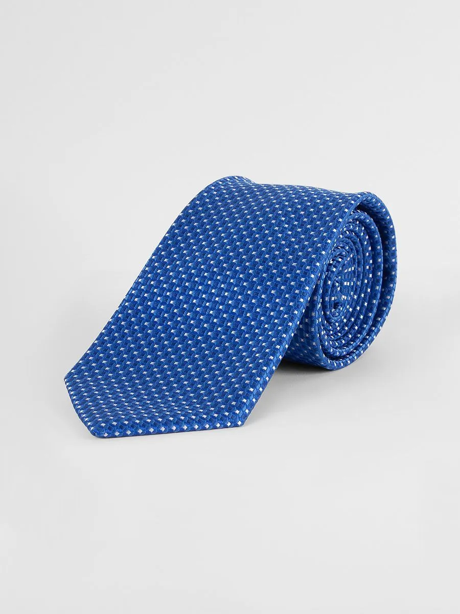 Яркий и нарядный галстук предназначен для создания торжественных образов. Различные оттенки синего и белого создают точечную фактуру. Глянцевые нитки придают галстуку едва заметный благородный блеск.