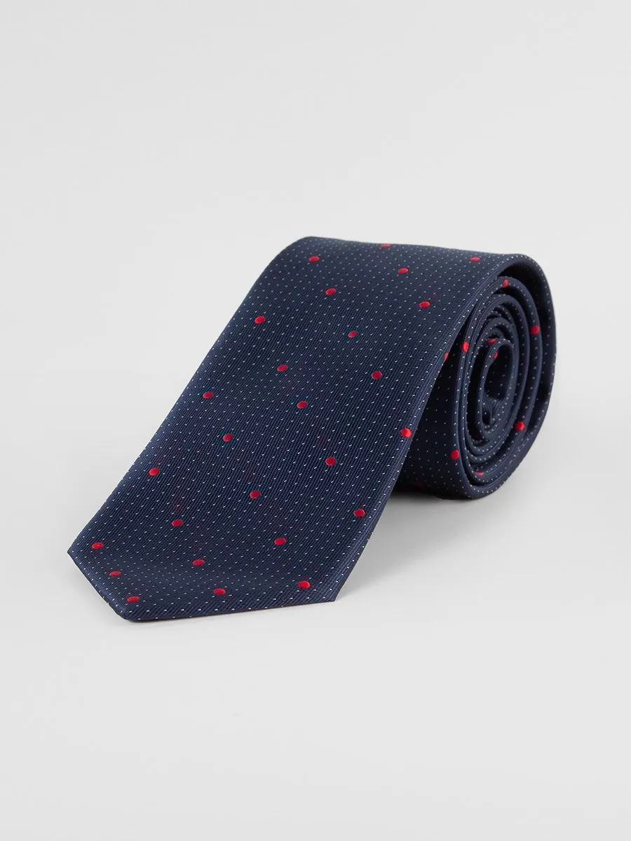 Темно-синий галстук с мелкими белыми точками и красными точками побольше выполнен из 100% микрофибры. Внутри есть подклад. Силуэт у галстука широкий- 8см в самом широком месте.