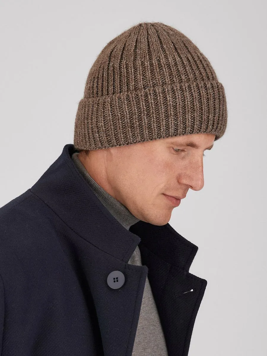 Мужская шапка в серо-бежевых тонах искусно сочетает в себе тепло альпаки (10%) и долговечность шерсти (50%). Аккуратный отворот и контурная макушка завершают образ.