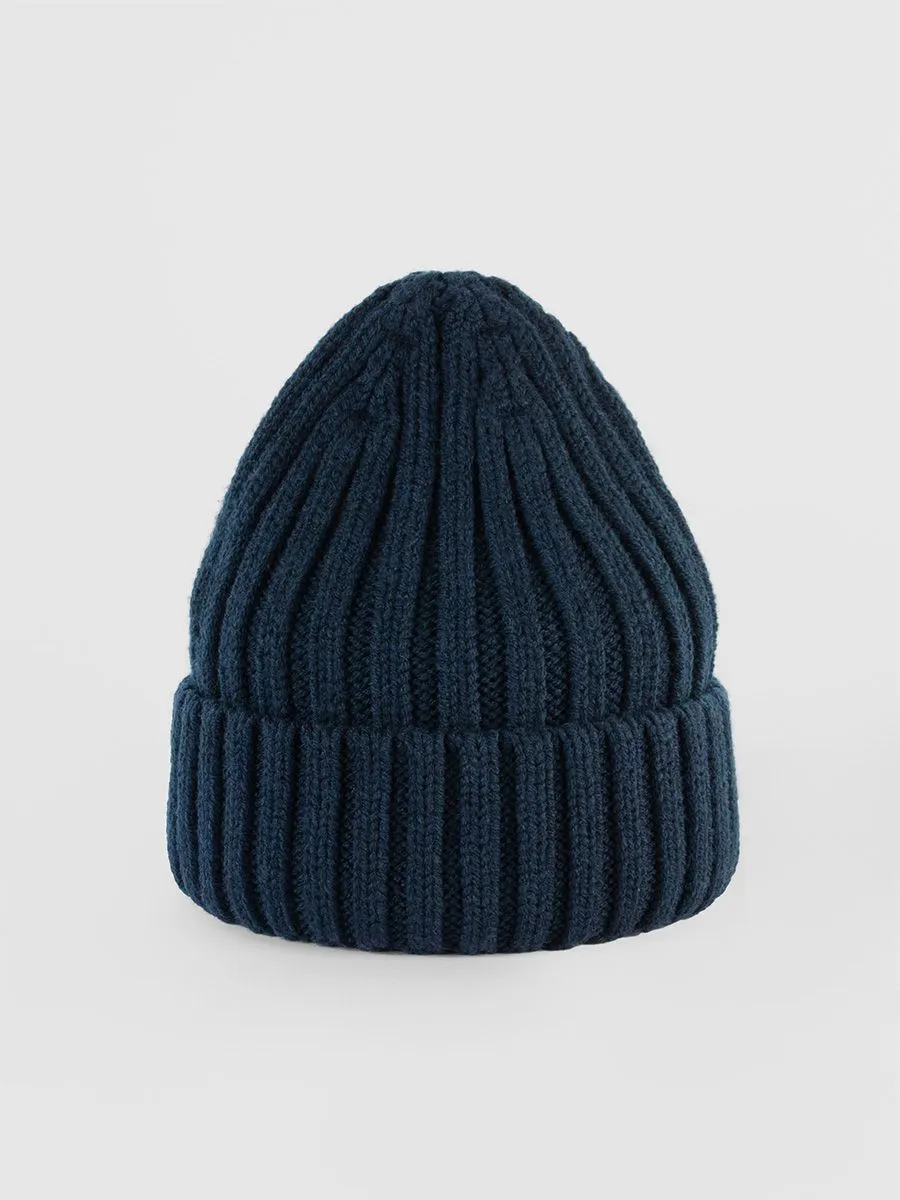 Шапка выполнена в спокойном темно-синем цвете, поэтому легко впишется в любой образ. Шапка имеет в своем составе 30% шерсти, а изнутри есть флисовый подклад, что обеспечит тепло в самое холодное время года. Модель напоминает шапку-бини, которая так популярна последние несколько лет.