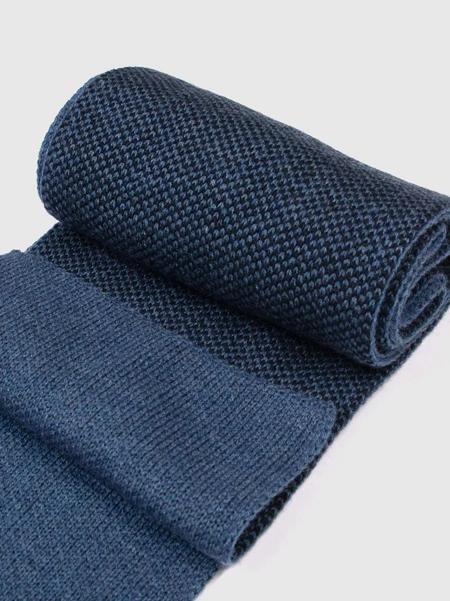 Эластичный мужской шарф, с содержанием шерсти будет отличным вариантом для демисезона. С одной стороны шарф имеет насыщенный темно-синий цвет, с другой стороны более светлый и однотонный синий цвет.
