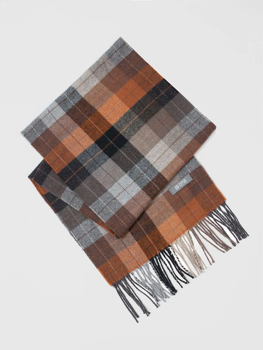 Мужской шарф в клетку выполнен в традиционных осенних оранжево-коричневых оттенках. Такой шарф будет гармонировать не только с владельцем, но и с окружающей природой в ее золотистом наряде. Мягкий на ощупь и приятный в носке шарф согреет в демисезон. Размер шарфа 31 * 190 см.