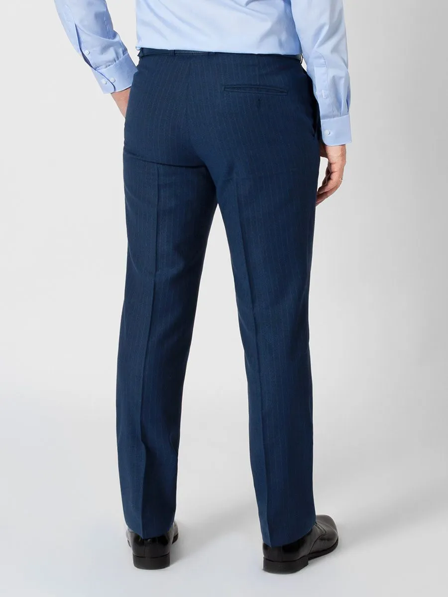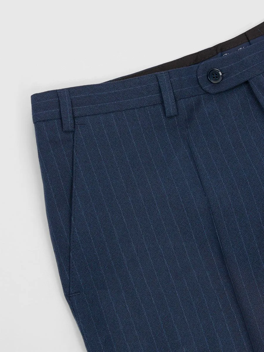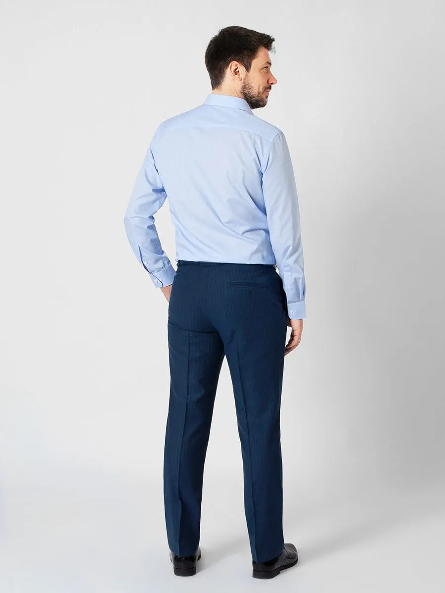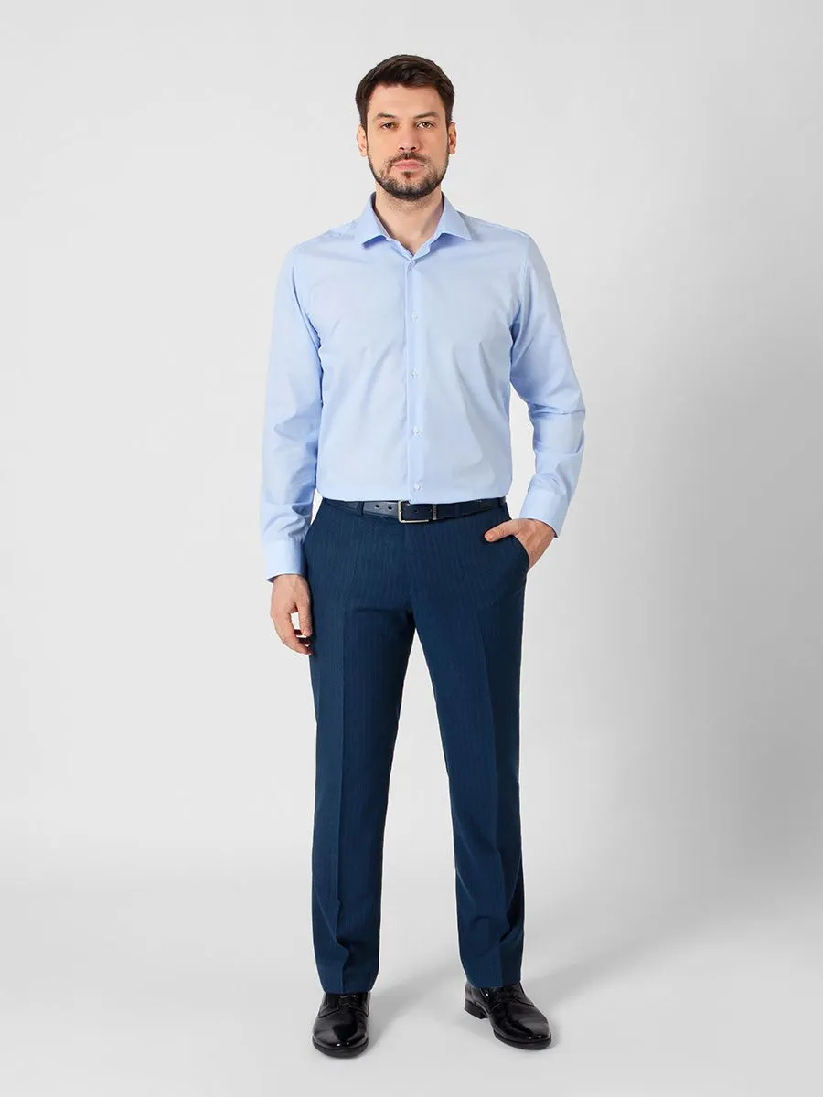 Мужские брюки Claudio Verdi изготовлены из эластичной ткани темно-синего цвета с тонкой деликатной полоской более светлого оттенка. Такие брюки визуально вытягивают фигуру и создают хороший тендем с голубой сорочкой. Брюки выполнены в самой популярной модели среди наших классический брюк П-263. Покупатели ценят в данной модели удобство посадки, глубину карманов и в меру выполненное заужение.