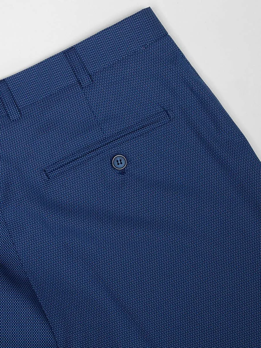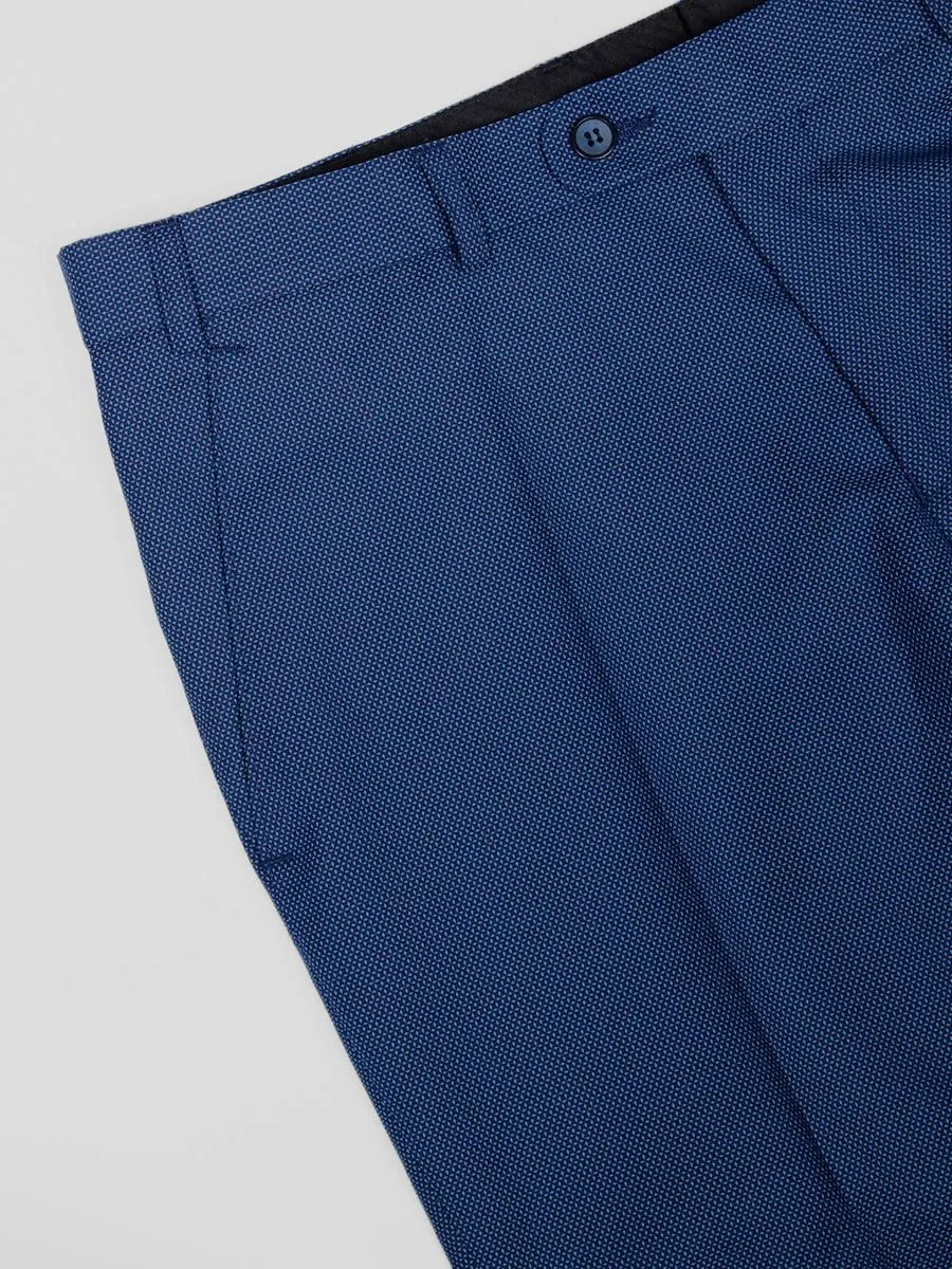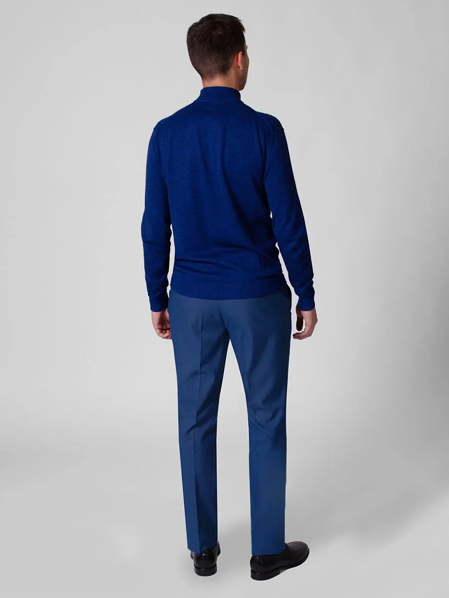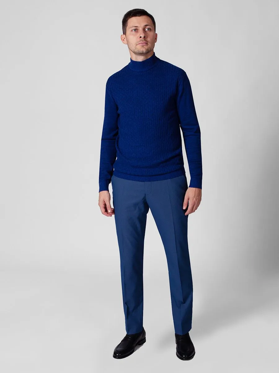 Мужские брюки Peplos исполнены в насыщенном голубом цвете с очень интересным микродизайном и подойдут для торжественных мероприятий. Они прекрасно дополняют строгий образ и придают чуть больше шика. Такие брюки можно сочетать с непарными пиджаками или просто с классической рубашкой, особенно в жаркую погоду, когда вам нужно выглядеть прилично. А в прохладное время образ можно завершить синим джемпером KN21J005 с высоким воротником.