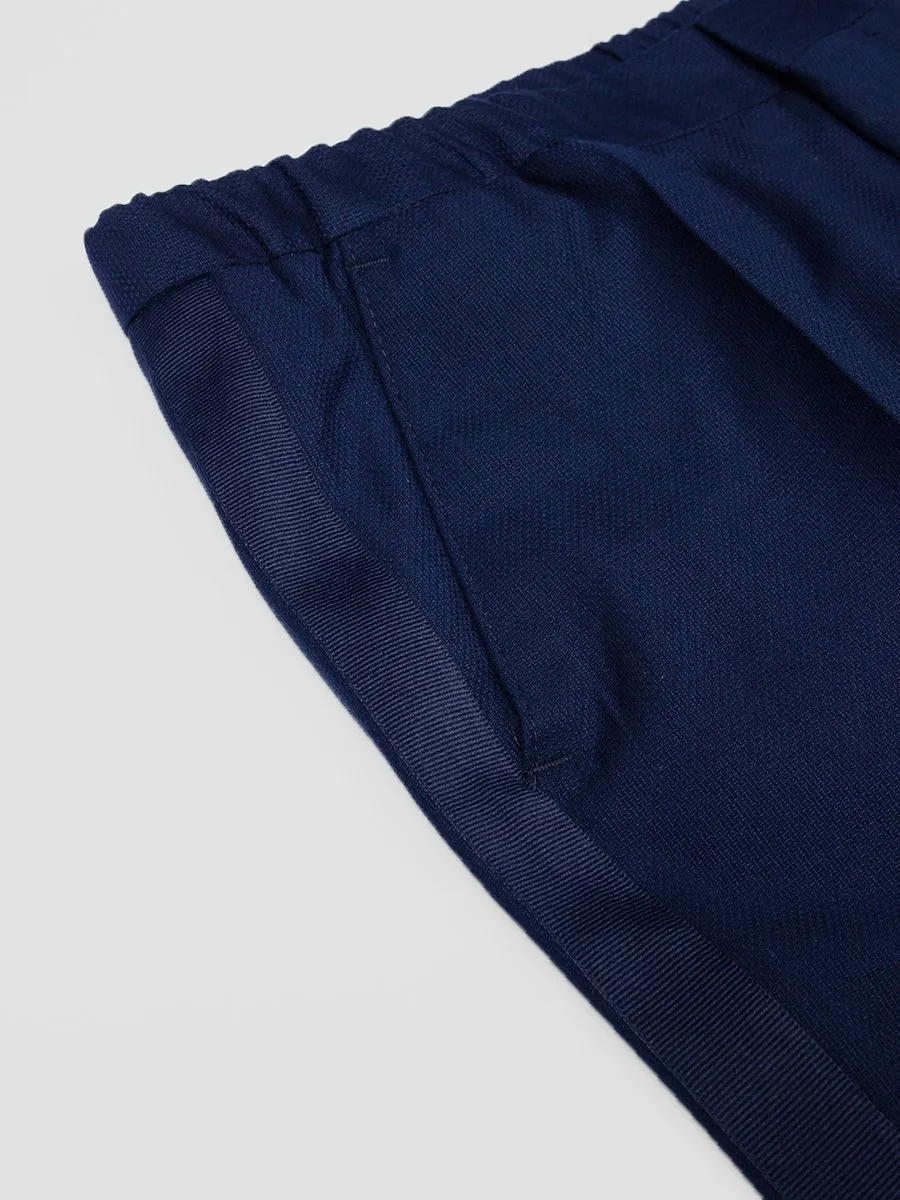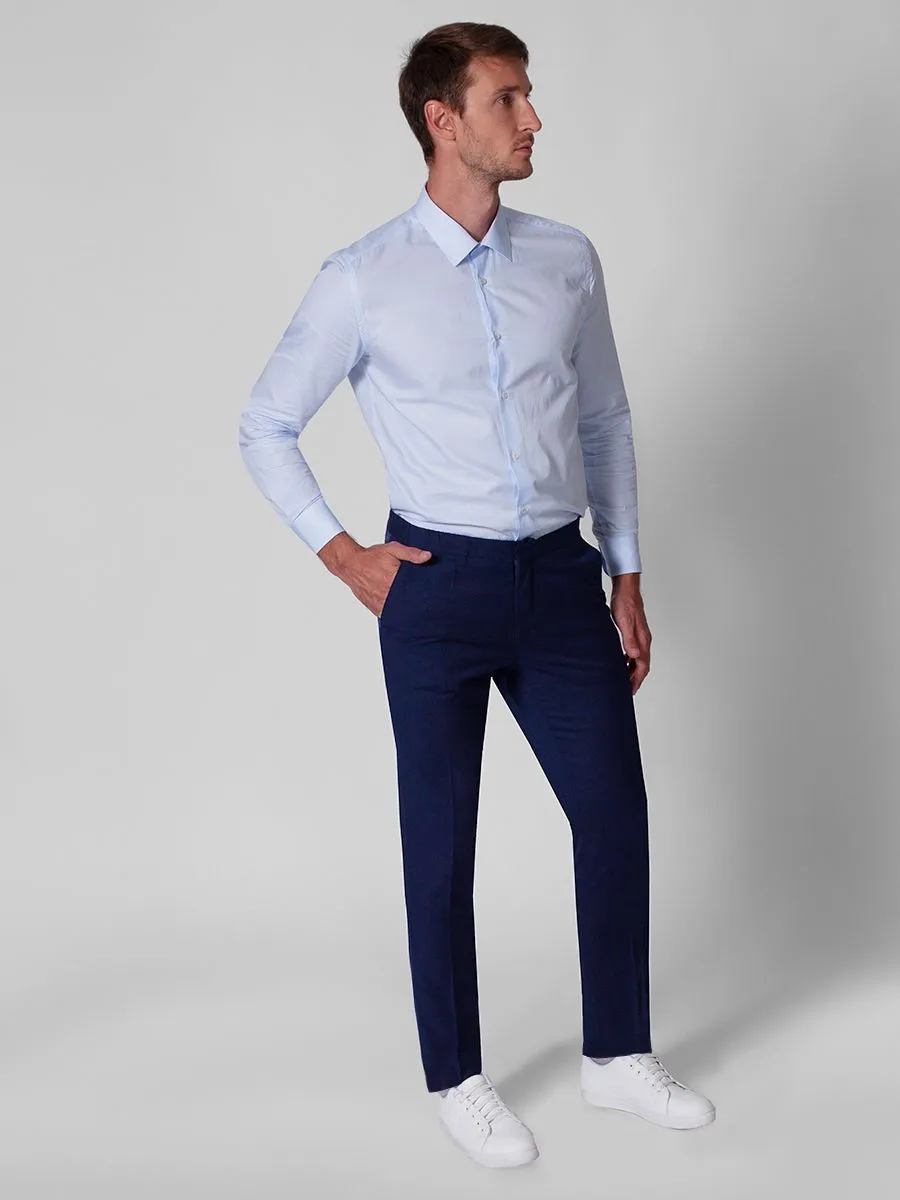 Считается, что классический стиль в одежде не предполагает наличие каких-либо декоративных элементов. В последние несколько сезонов таким своеобразным элементом фьюжена являются брюки с лампасами. Офисный дресс-код, а также дресс-код официальных мероприятий и деловых встреч предусматривает элегантный и сдержанный вид. Темно-синий двубортный пиджак JA20032-SL и брюки с полоской в тон станут идеальным модным решением. Данная модель брюк на резинке позволяет отказаться от ремня и подтяжек, делая брюки более практичными. Их также можно сочетать не только с деловой, но и спортивной обувью, например, белыми кедами.