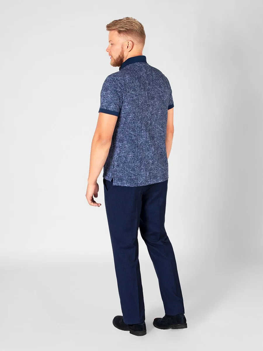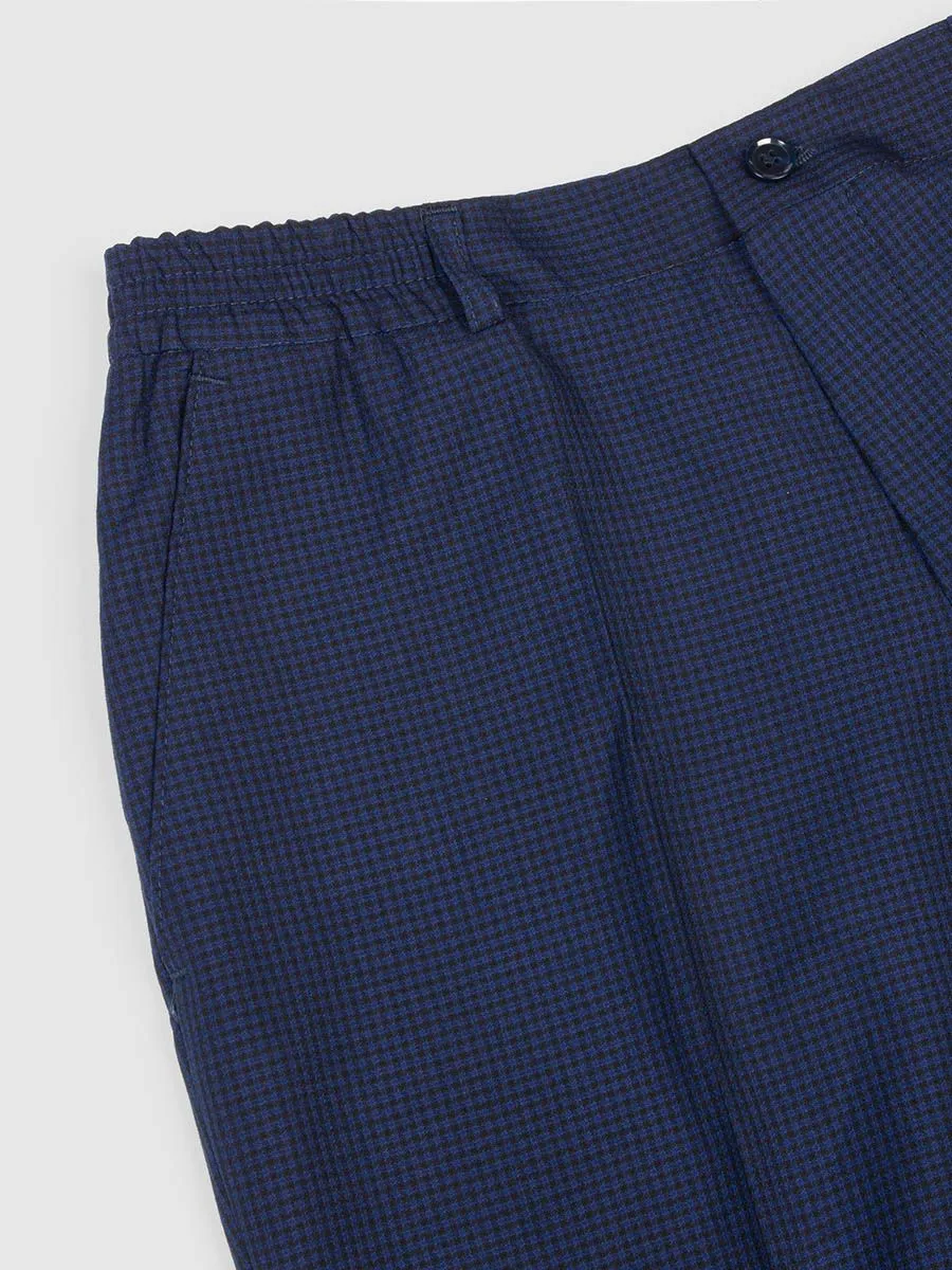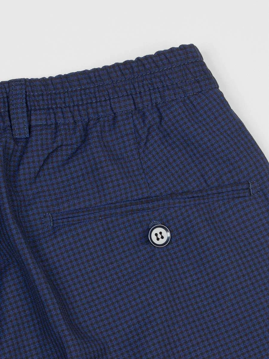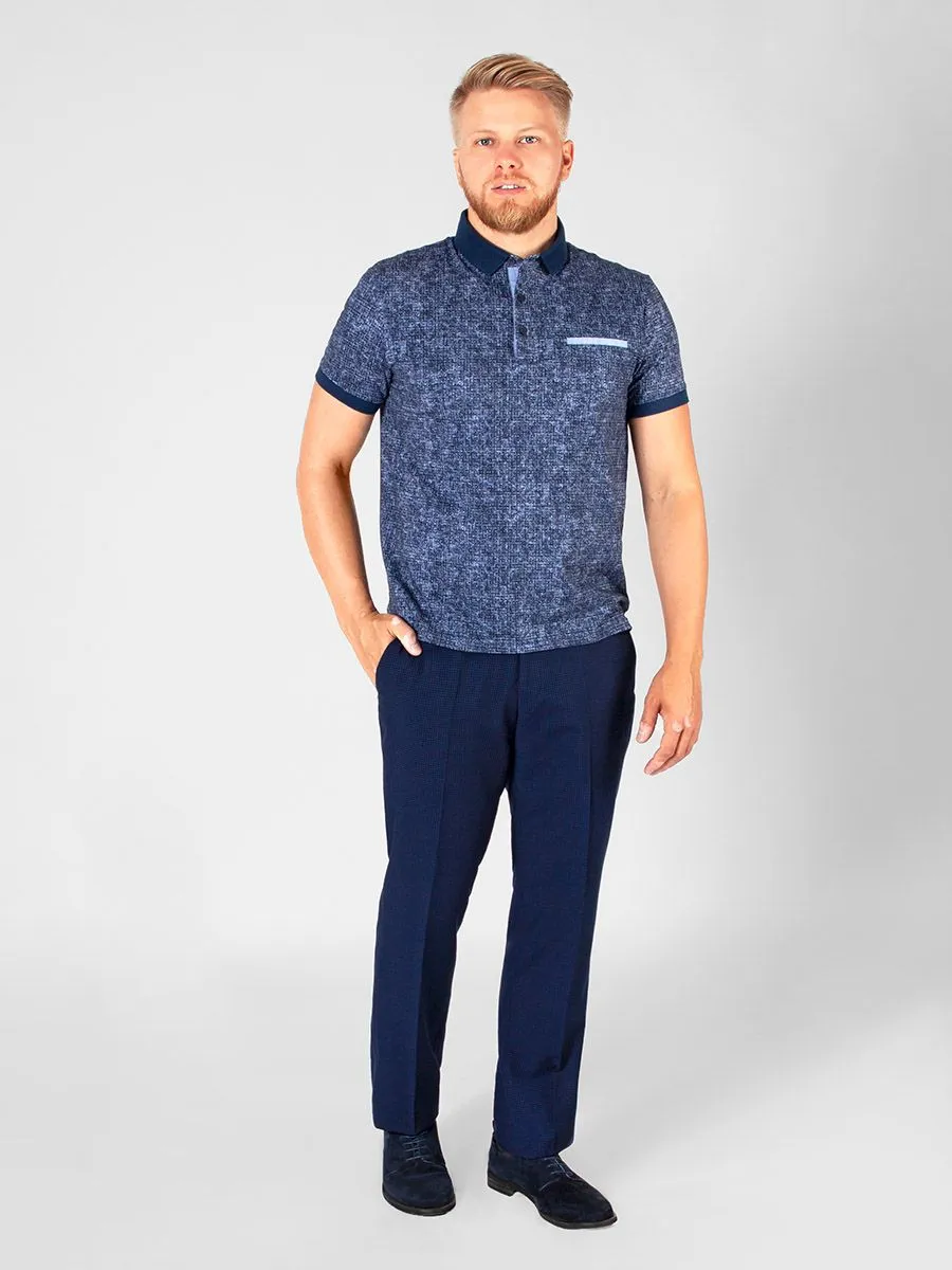 Мужские брюки на резинке - это беспроигрышный повседневный рабочий вариант. Резинка удобна, меньше давит на живот, но при желании можно надеть и ремень, так как шлевки тоже имеются. Силуэт у брюк довольно свободный, что также обеспечивает больше свободы в движениях. В остальном брюки классические - два боковых кармана, один задний, стрелки, темно-синий цвет и микродизайн в виде очень елкаойклеткаи