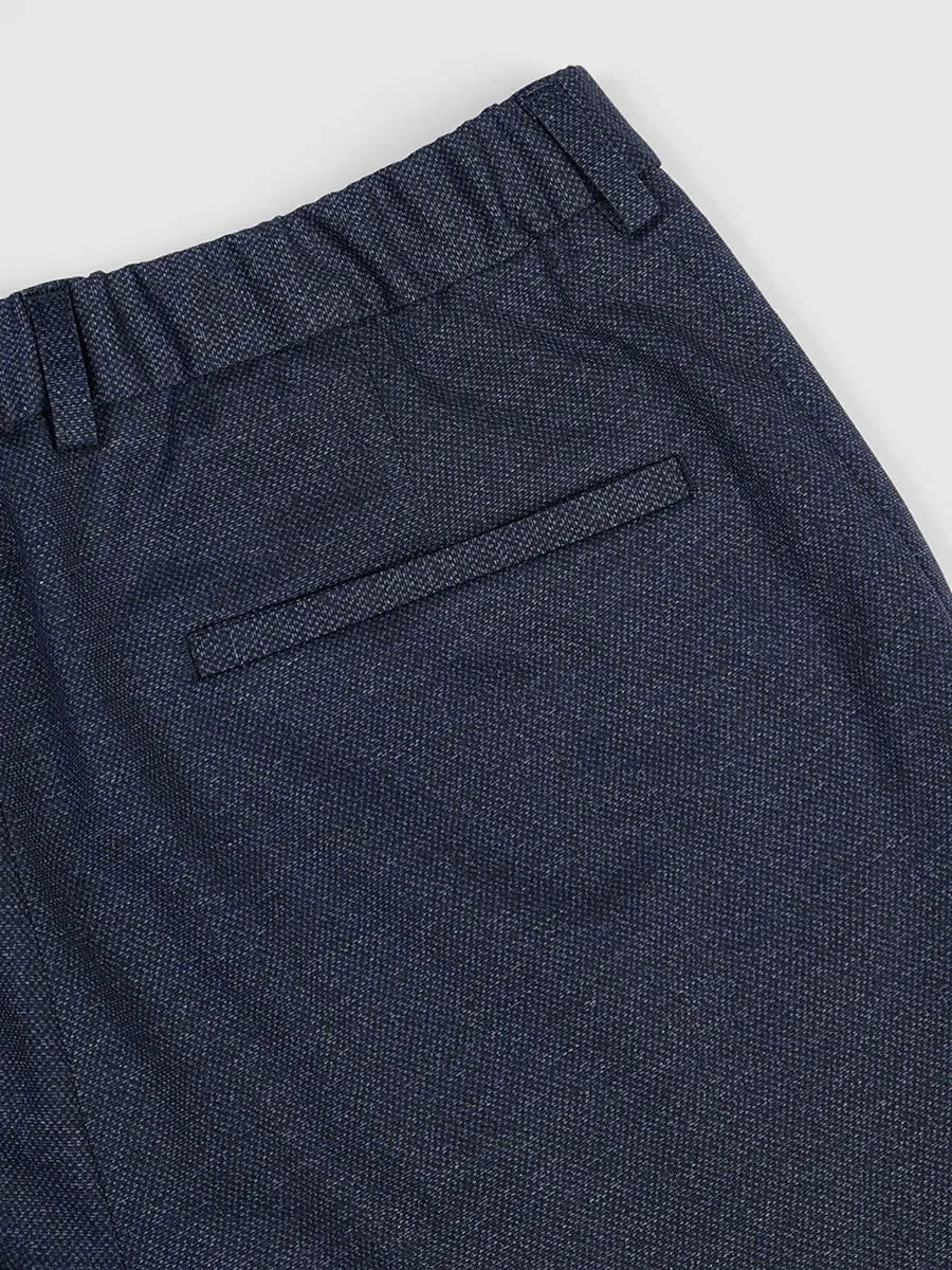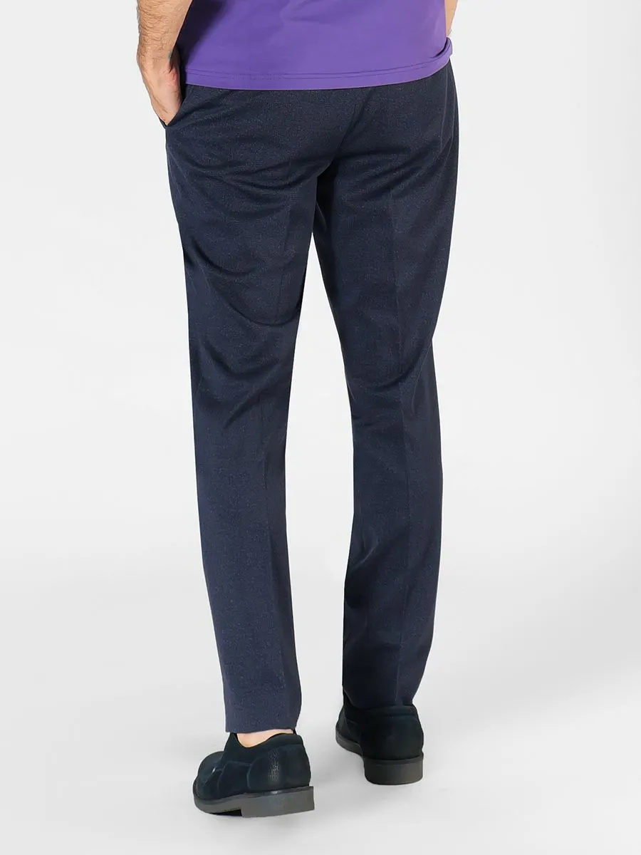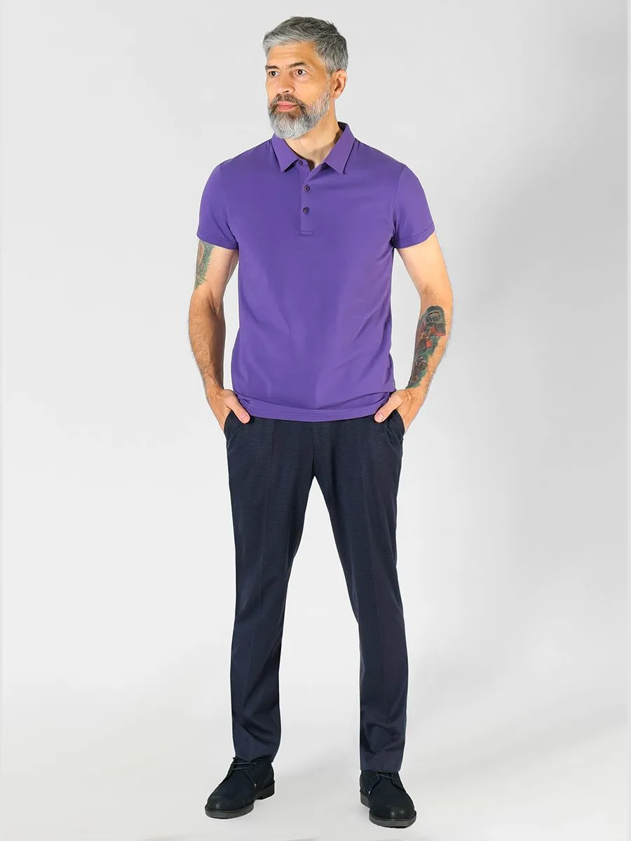 Современные мужские темно-синие брюки со стрелками и резинкой на талии. Брюки заужены к низу. В комплект входит мужская рубашка-поло TS22021-P фиолетового цвета. Фиолетовое поло и темно-синие брюки привлекают внимание оригинальностью, делая владельца особенным.
