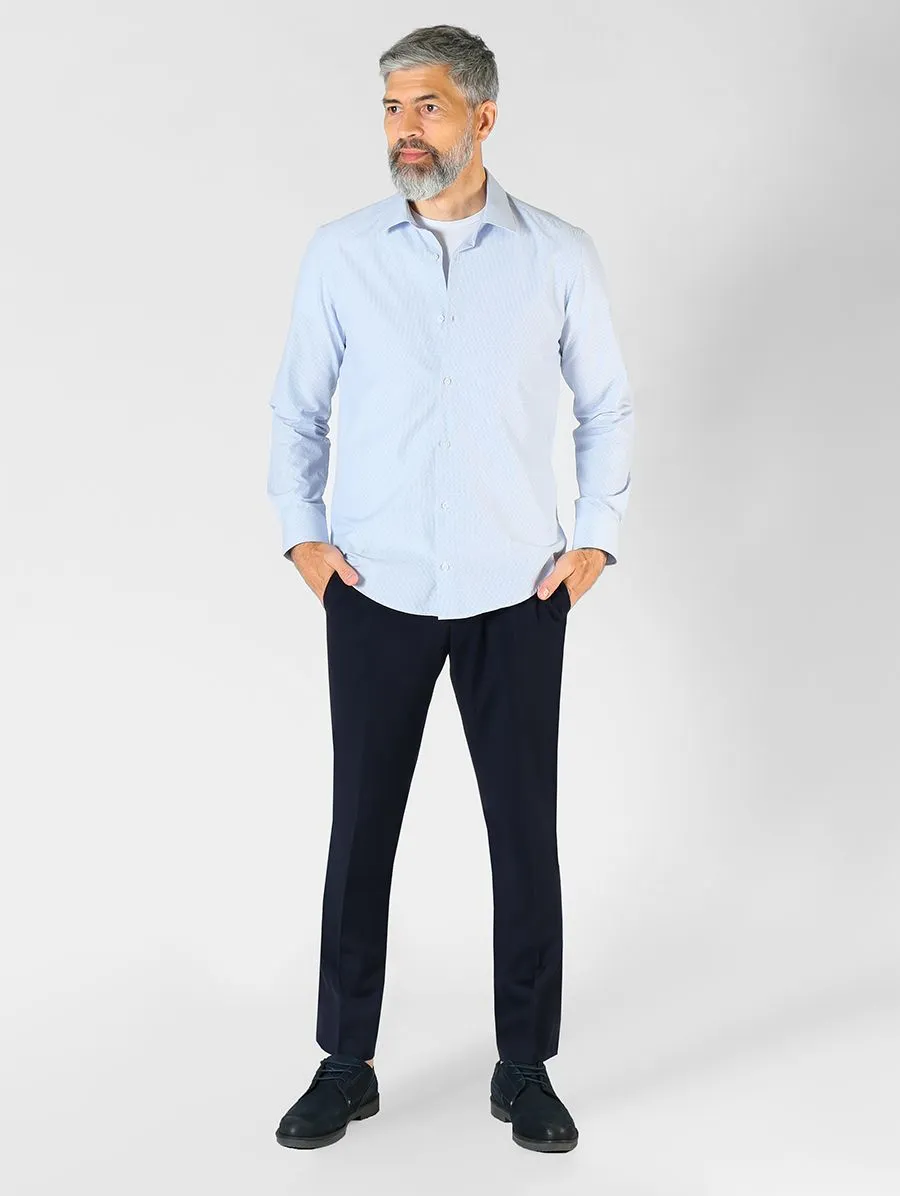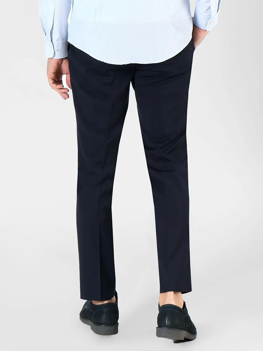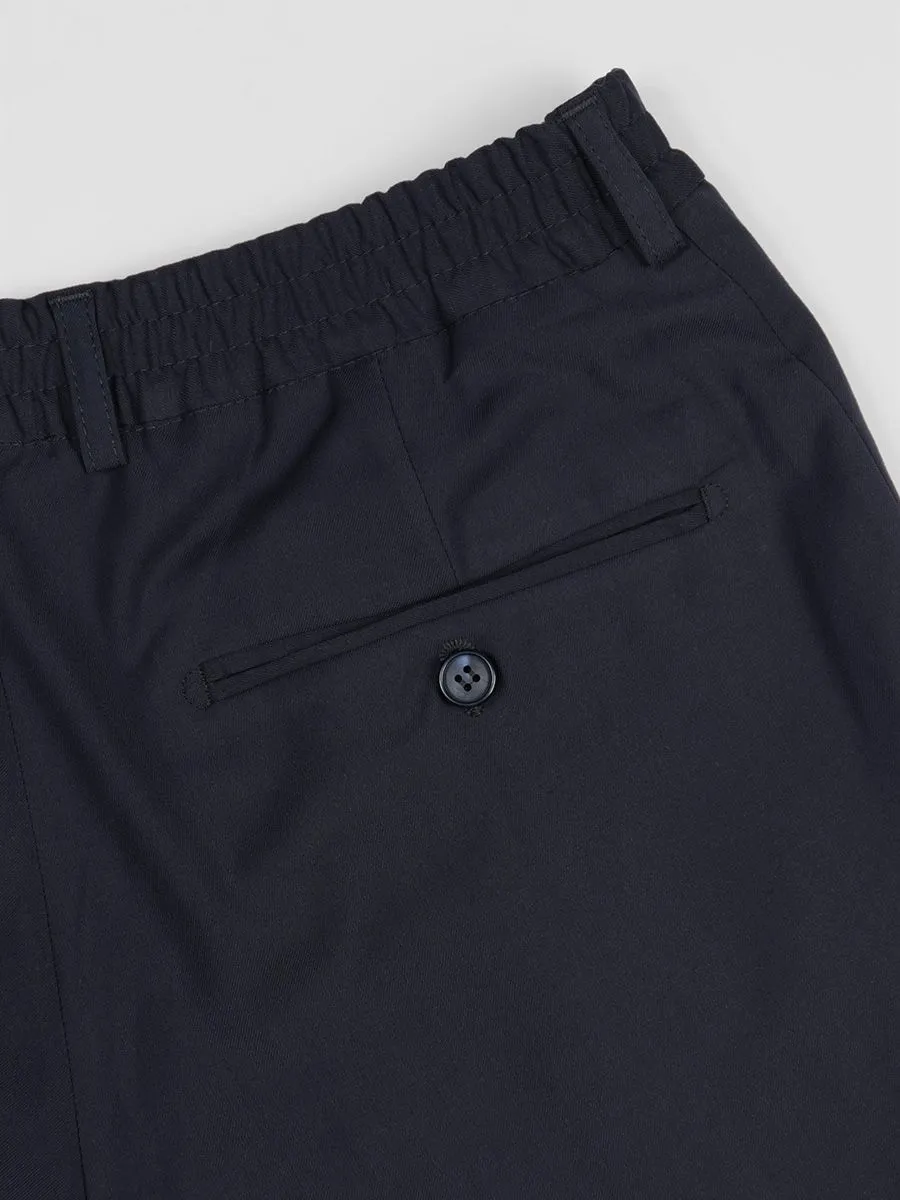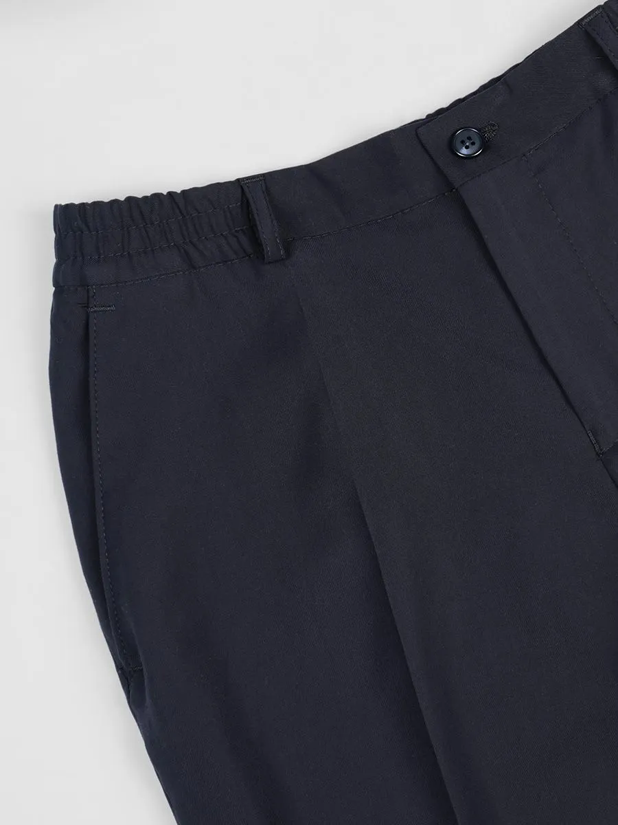 Брюки выполнены в популярной и современной модели на резинке. Резинка позволяет носить брюки без ремня и ощущать больше комфорта. Силуэт брюк зауженный. Цвет брюк темно-синий, ведь он является одним из самых востребованных цветов у мужчин при повседневной носке. Боковые карманы с подрезными бочками, сзади один карман.