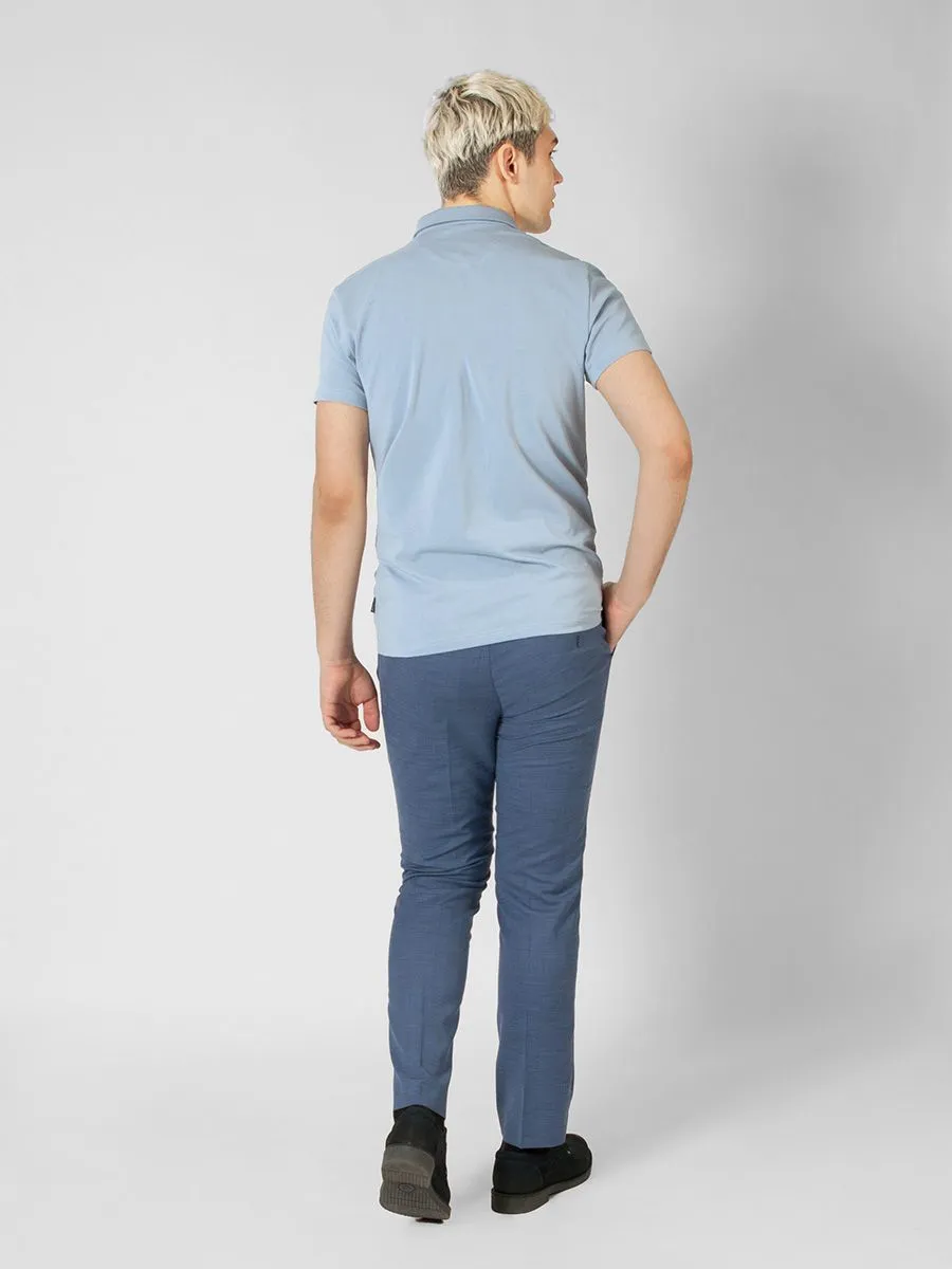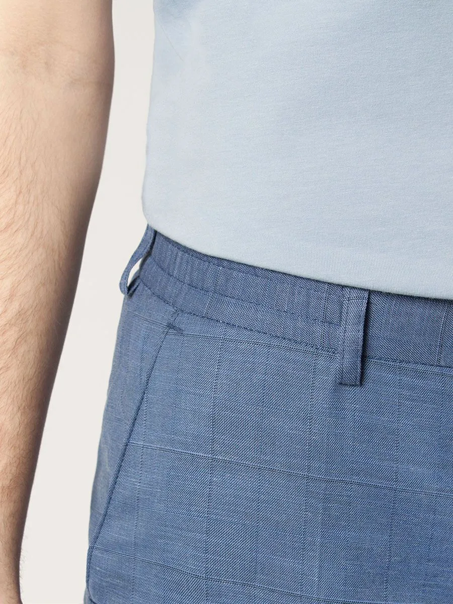Голубые брюки на резинке могут служить как дополнительные брюки к костюму SU22043-SL, поскольку изготовлены из той же ткани. При этом они могут показаться более удобными за счет вставки мягкой резинки по бокам. У брюк интересная фактура, которая достигается за счет добавления в состав льна.