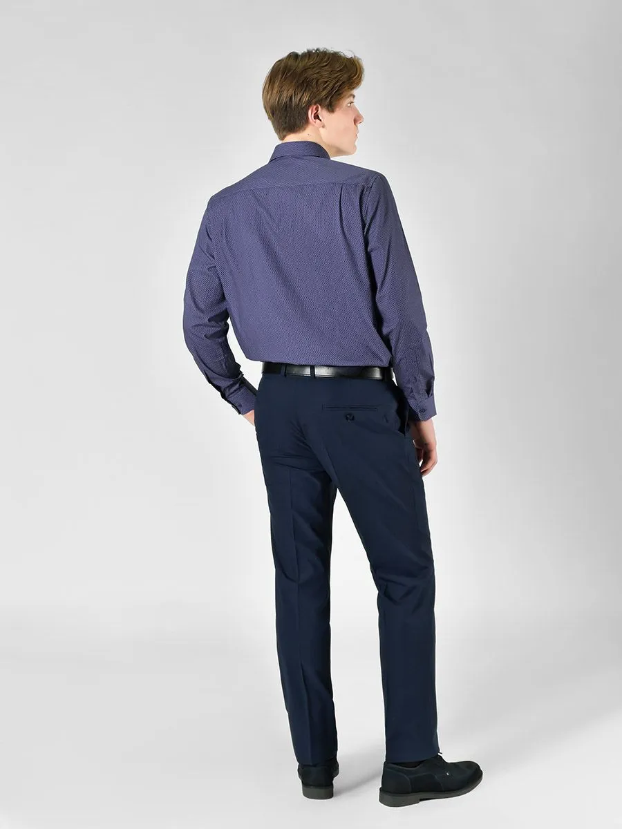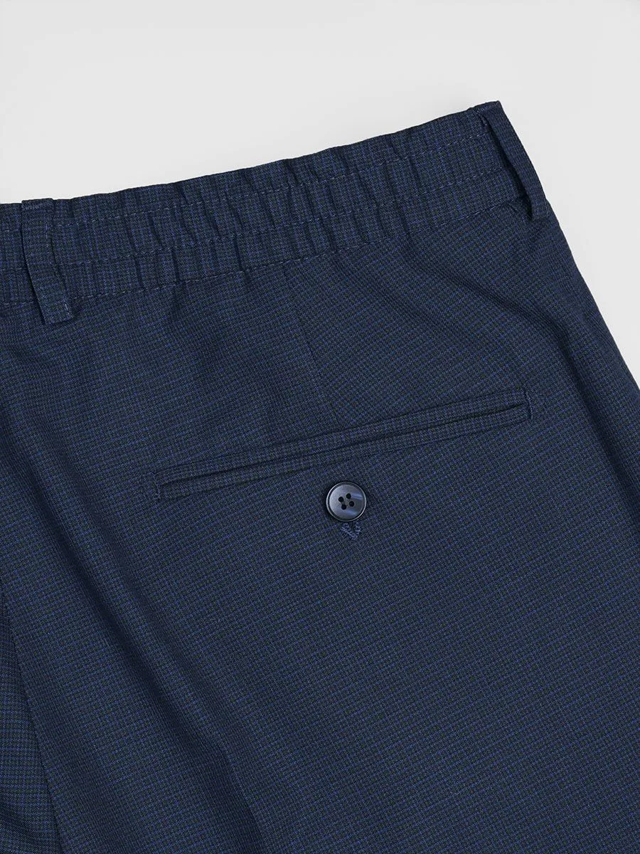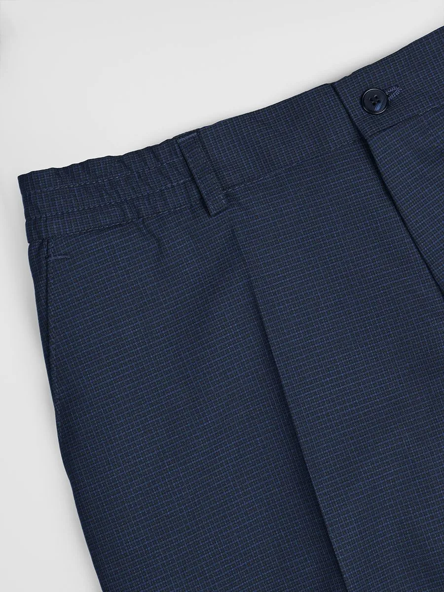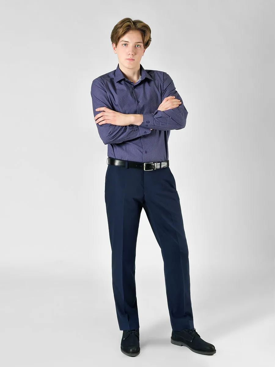 Классические синие брюки выполнены в современной модели, в которой предусмотрена резинка на поясе и умеренно зауженный силуэт. Резинка на поясе позволяет носить брюки без ремня, но вместе с тем есть шлевки для ремня. Ткань брюк имеет микродизайн в виде очень мелких клеточек. У брюк довольно широкая размерная сетка до 128 (64) размера.