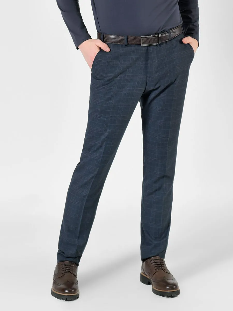 В первую очередь, в данных классических брюках притягивает внимание необычный цвет с интересным рисунком клетки. Если присмотреться, то можно увидеть, что клетка образована переплетением нитей различного цвета, начиная от голубого и заканчивая бордовым. Именно поэтому основной оттенок получается таким сложным, который сложно описать одним словом. Силуэт брюк равномерно заужается к низу.
