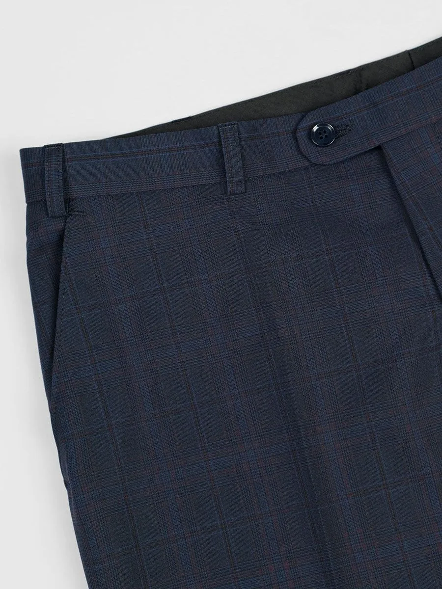 Ткань брюк имеет интересную расцветку в виде тонкой клетки, образующуюся пересечением синих и бордовых нитей. Но клетка не контрастная, поэтому ее можно увидеть с близкого расстояния, издалека брюки кажутся однотонными. Помимо привлекательной расцветки брюки выделяет удобная посадка, присущая одной из самых популярных моделей.