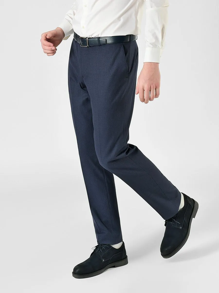 Классические мужские брюки имеют современную модель с плавным заужением к низу. Ткань брюк фактурная с микродизайном. В состав ткани входит полиэстер, вискоза и спандекс, благодаря чему брюки наделяются такими свойствами как: износостойкость, воздухопроницаемость и эластичность. Поэтому данные брюки являются универсальным вариантом для ежедневной носки, чему также способствует нейтральный синий цвет брюк.