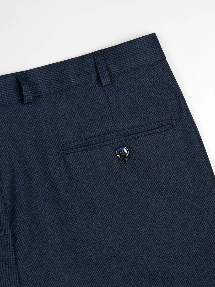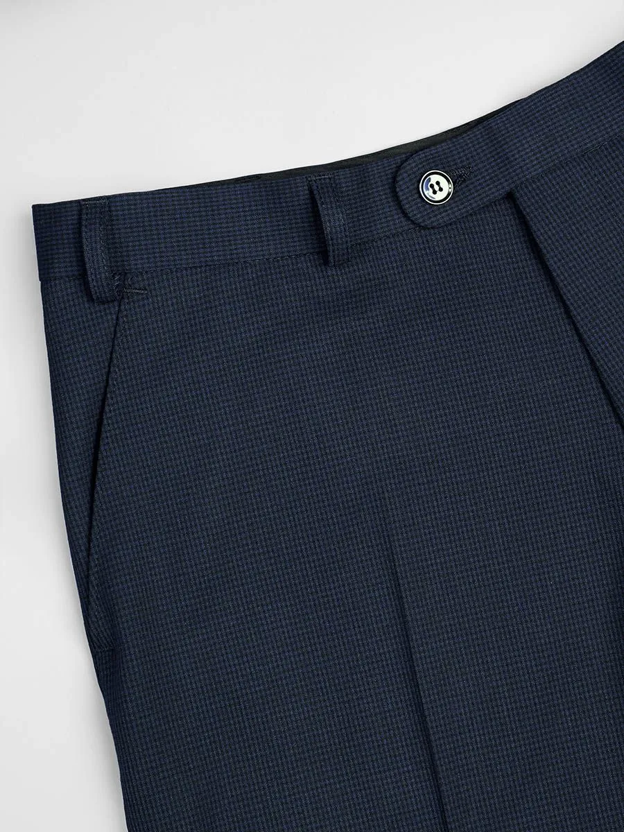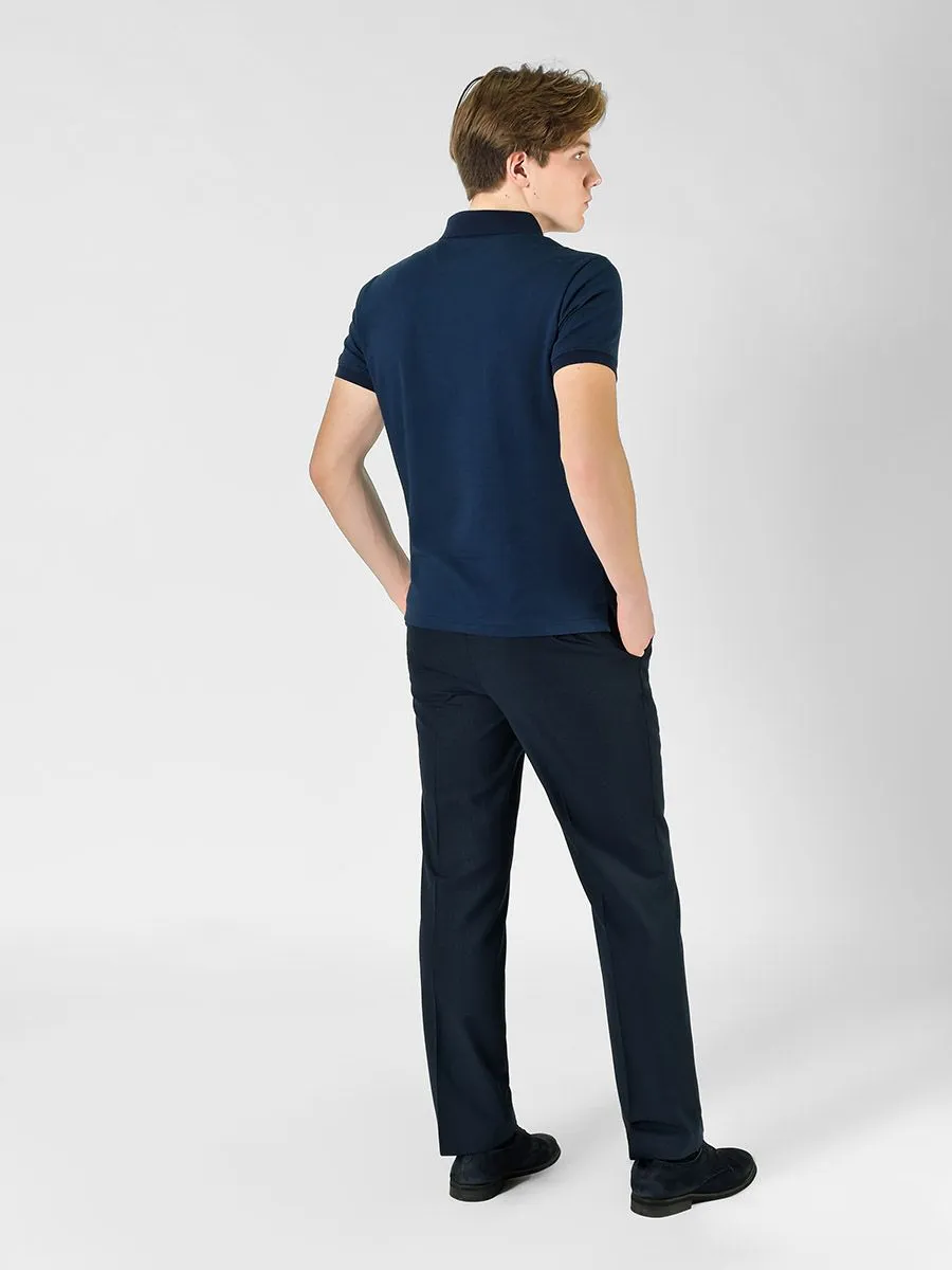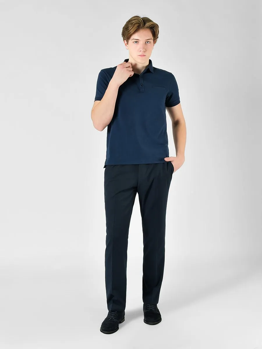 Мужские классические брюки выполнены в популярной прямой модели. Удобная посадка, учитывающая анатомические особенности, и свободное облегание сделали модель одним из лидеров продаж. Мелкий рисунок ткани едва заметен и больше влияет на фактуру и цвет ткани. Синие нити переплетаются с черными и образуют глубокий синий цвет. Брюки легко подойдут для любого классического образа, но можно сделать и более расслабленный образ в сочетании с поло, например, TS23012-P.