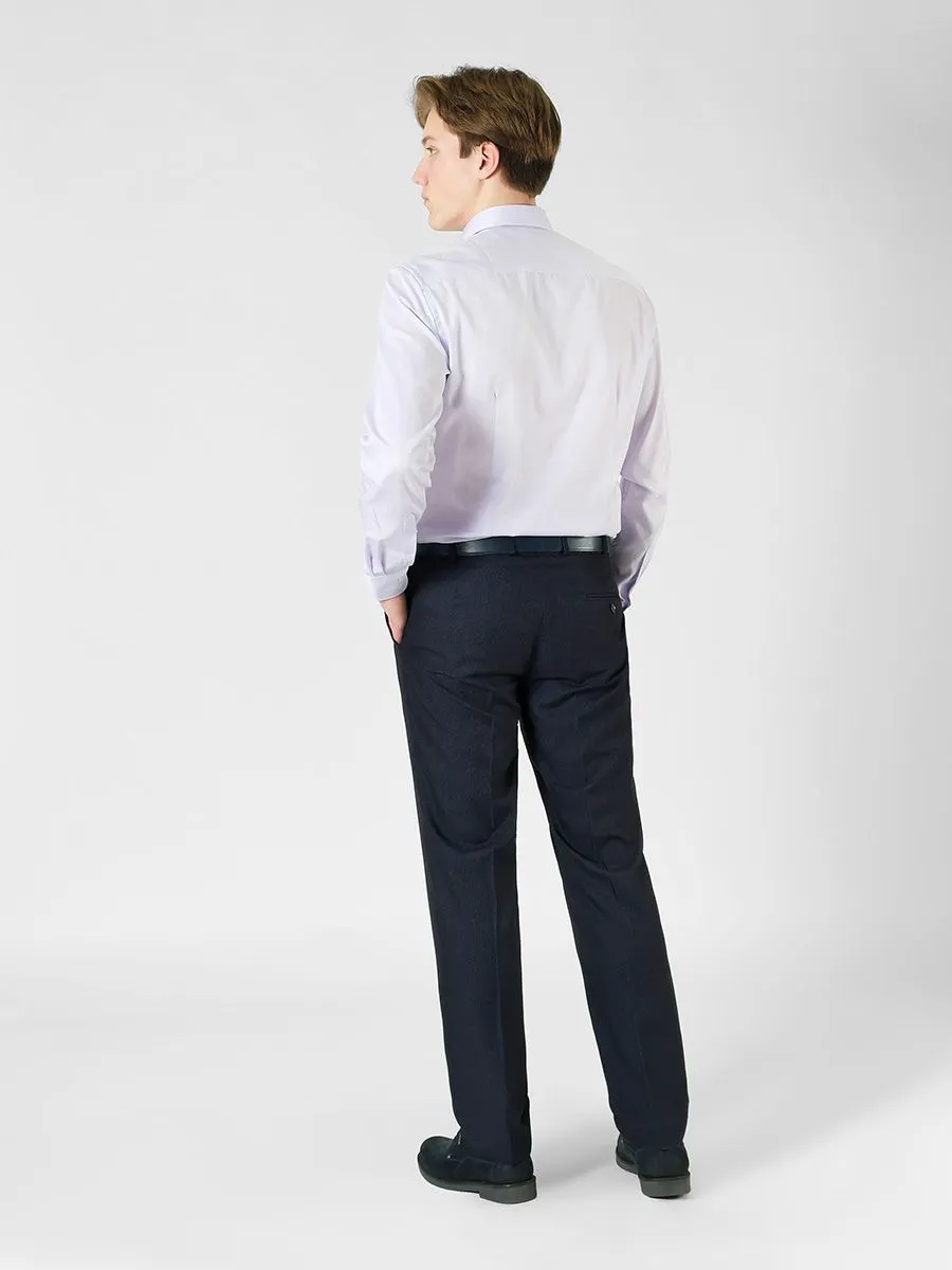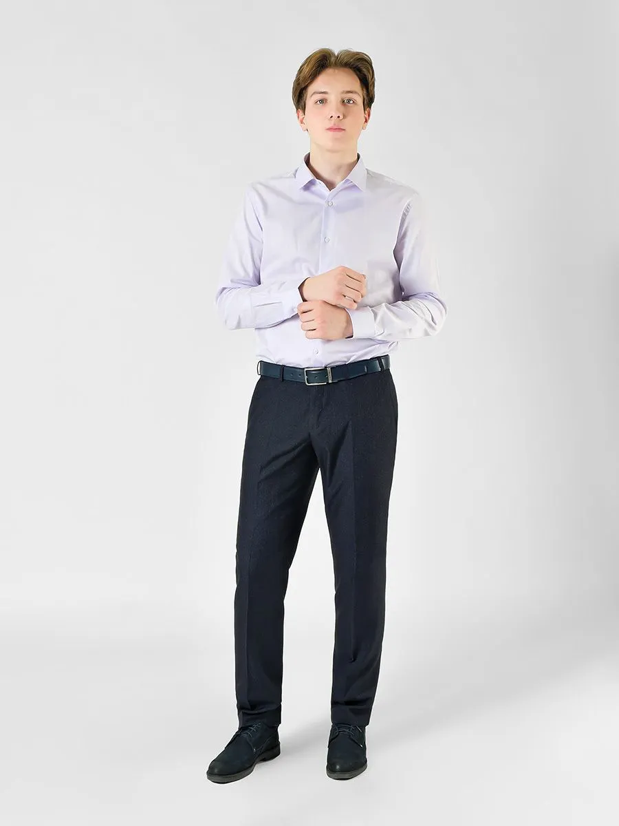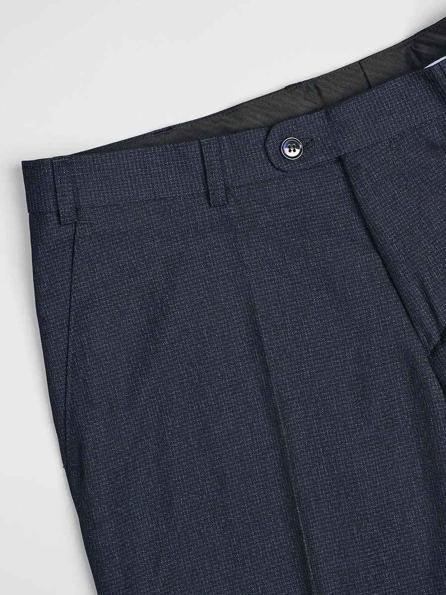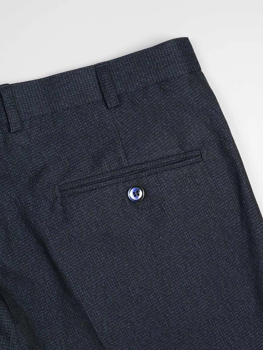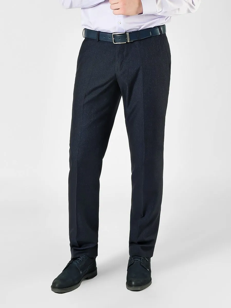 Мужские брюки выполнены из ткани темно-синего цвета с микродизайном и имеют прямой силуэт. Брюки имеют добнауюпосадкау которую уже оценили многие мужчины. У брюк два классических боковых кармана с отрезными бочками и один задний в рамку. С брюками можно составить множество классических образов для любого делового события.
