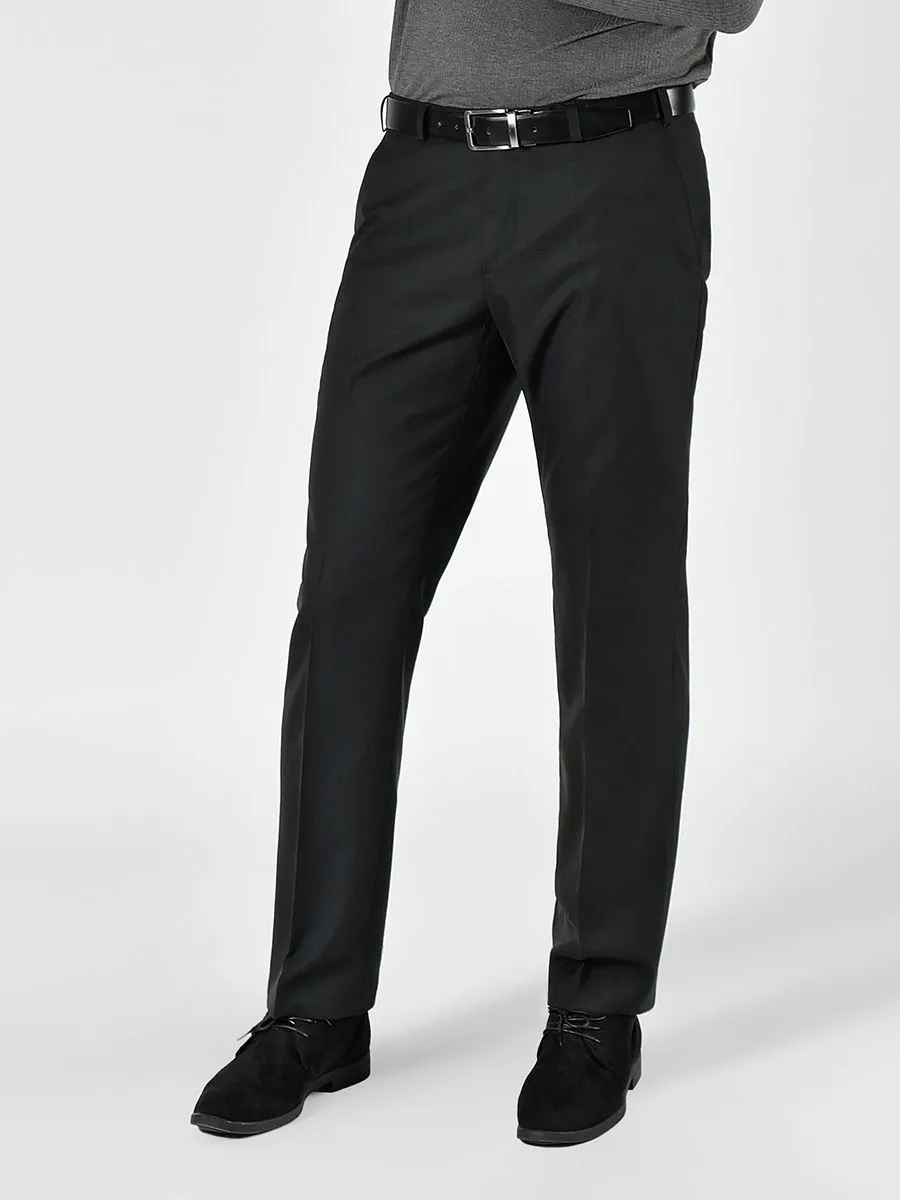 Классические мужские черные брюки изготовлены из ткани с содержанием шерсти 45%. Смешение полиэстера с шерстью обеспечивает более простой уход, меньшую усадку, поддержание формы и конечно, продолжительный срок службы. Сочетание однотонной черной ткани и прямого силуэта брюк является самым классическим вариантом на все случаи жизни.