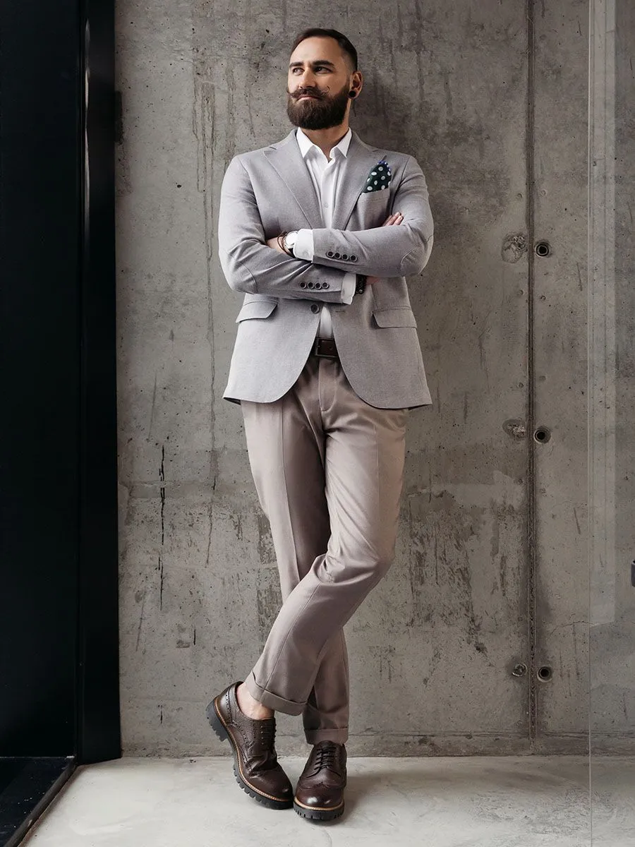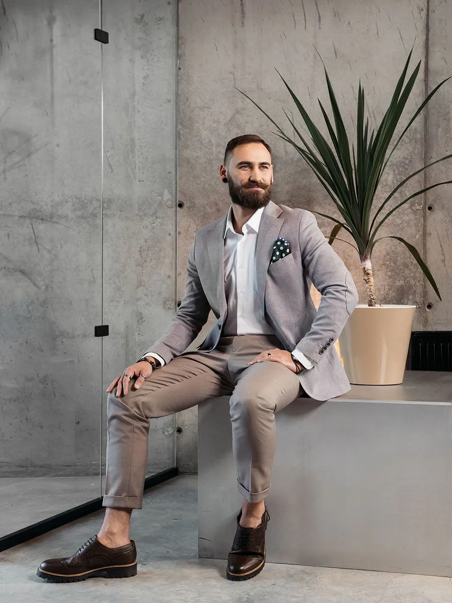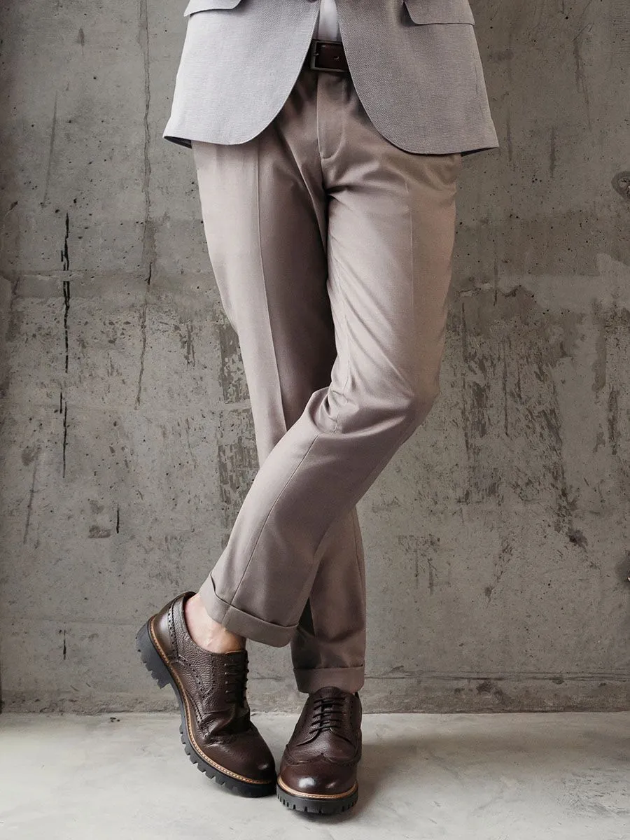 Новинка от Peplos - бежевые брюки на резинке и с подворотом. Брюки выполнены из тонкой деликатной ткани, поэтому лучшее время носки для них весна и лето. В таких брюках мужчина всегда будет выглядеть свежо, элегантно и нетривиально.