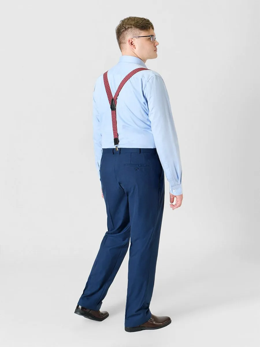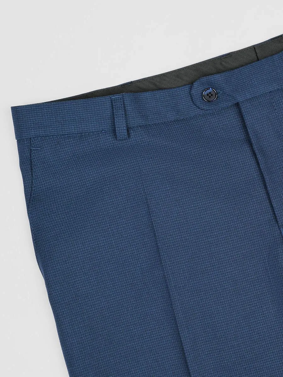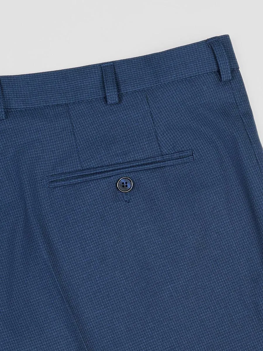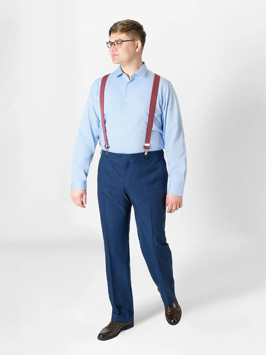 Классические брюки с прямым силуэтом обладают удобной посадкой и наибольшей свободой облегания. Данные брюки помогут разнообразить темный однотонный гардероб мужчины, поскольку синий оттенок брюк светлее стандартного темно-синего цвета, к тому же есть микродизайн. С брюками будут отлично смотреться голубые и белые сорочки, дополнить образ можно ремнем или оригинальными подтяжками.
