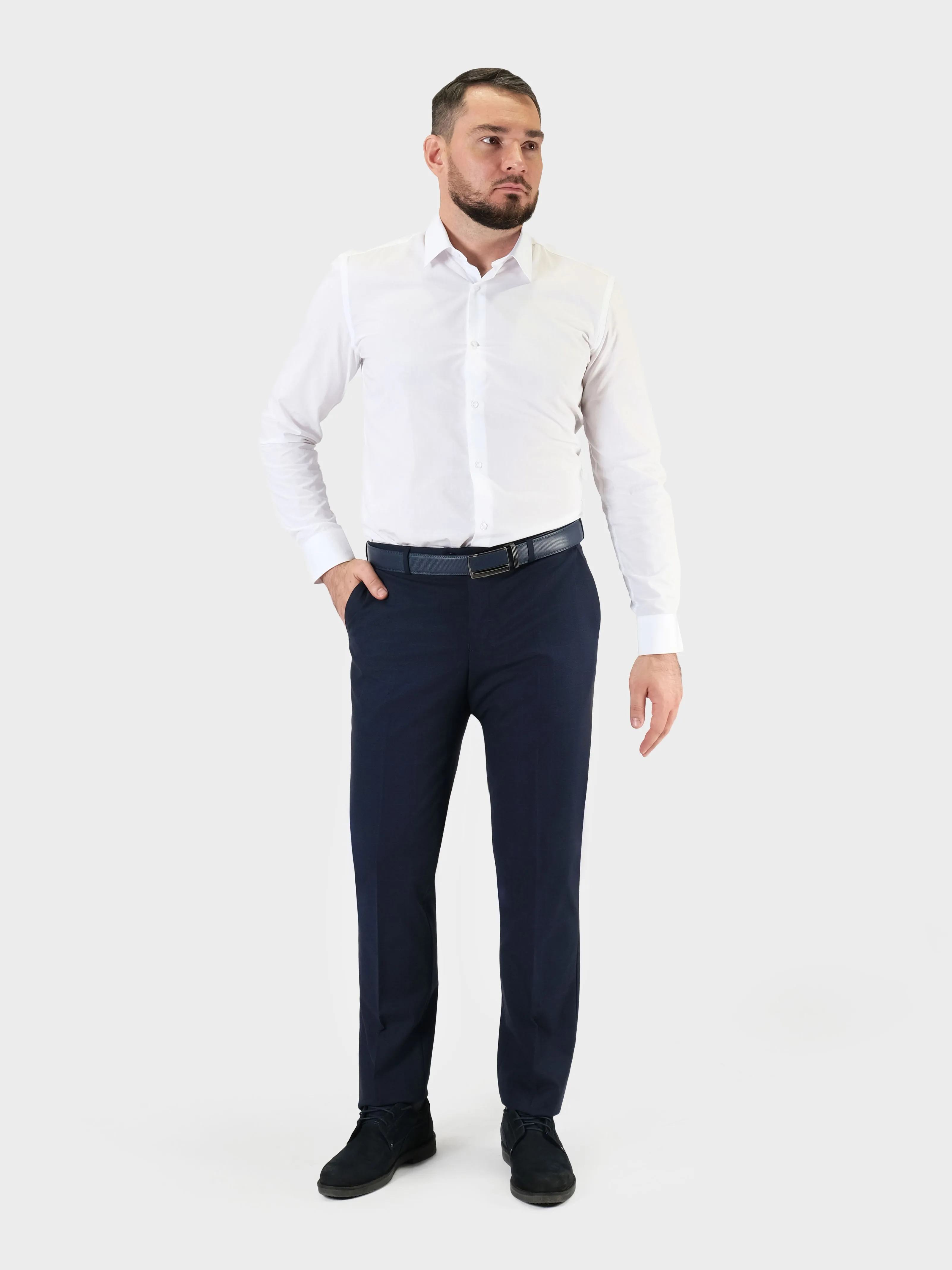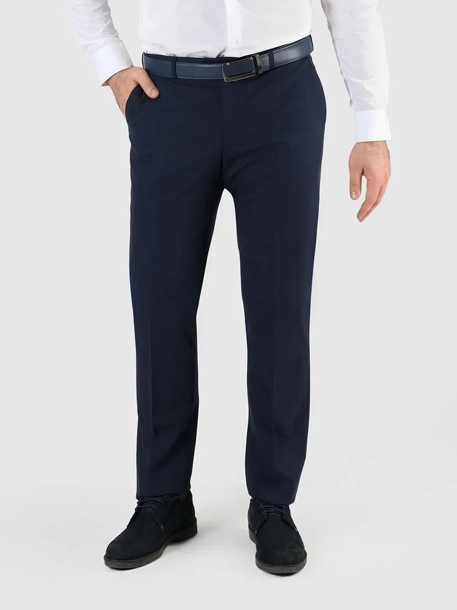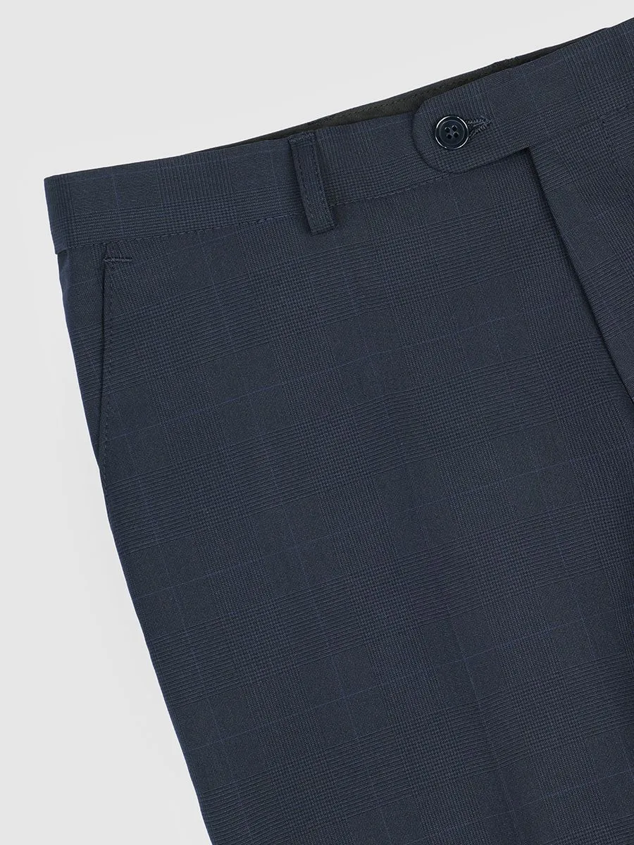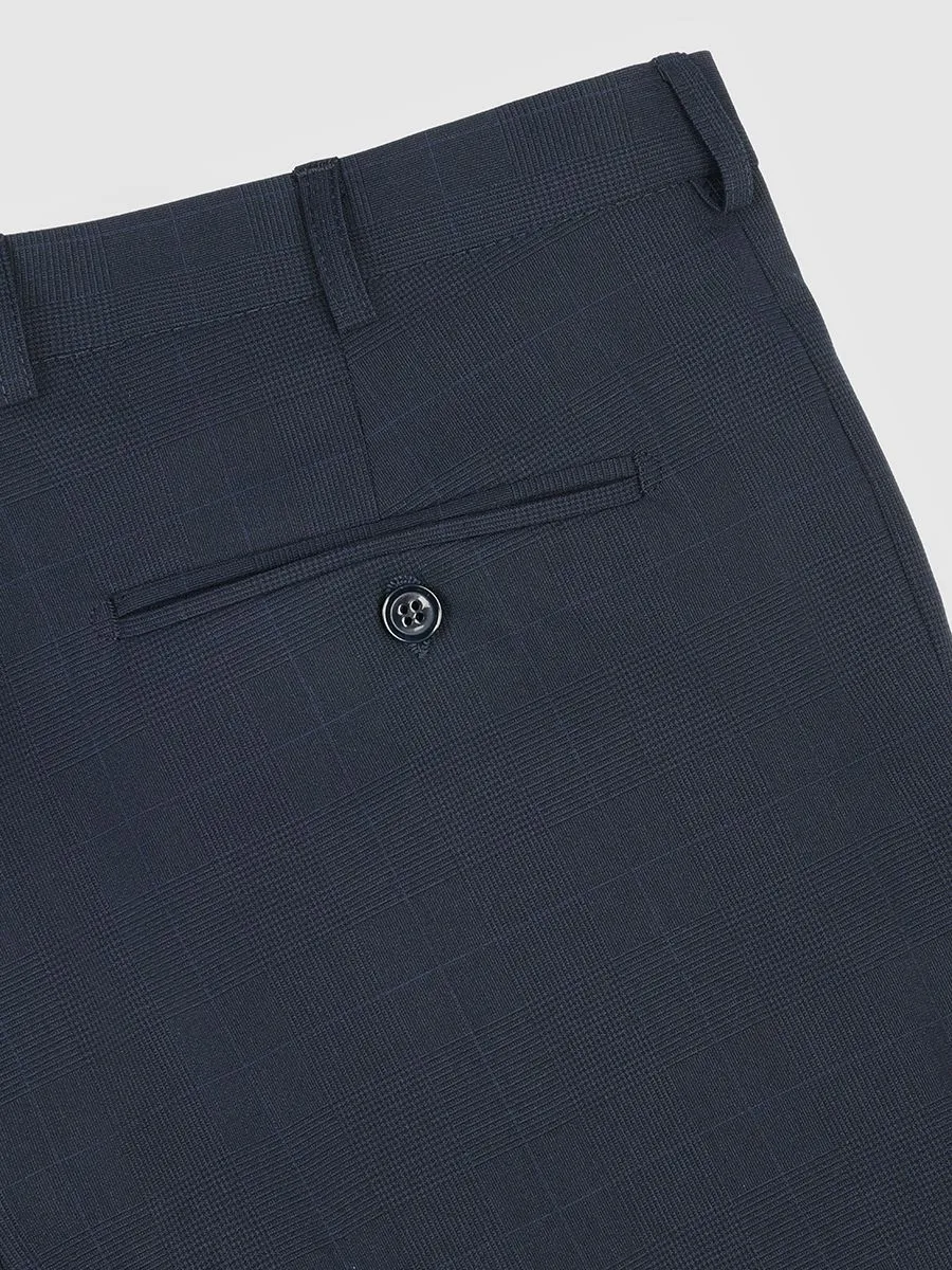 Темно-синие мужские брюки Peplos имеют прямой силуэт и удобную посадку. В составе ткани есть эластан (спандекс), что позволяет брюкам хорошо тянуться и в то же время принимать исходную форму. Благодаря спандексу на вещи практически не будут оставаться заломы. Темно-синяя ткань брюк имеет рисунок в виде неконтрастной клетки, которая придает брюкам оригинальный и стильный вид. На брюках есть два кармана с отрезными бочками и задний карман в рамку. Эти брюки дополнят базовый гардероб современного делового мужчины.