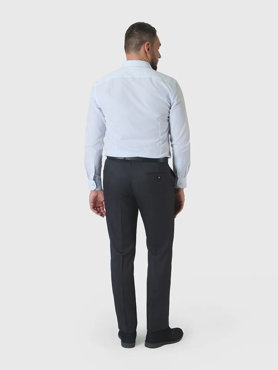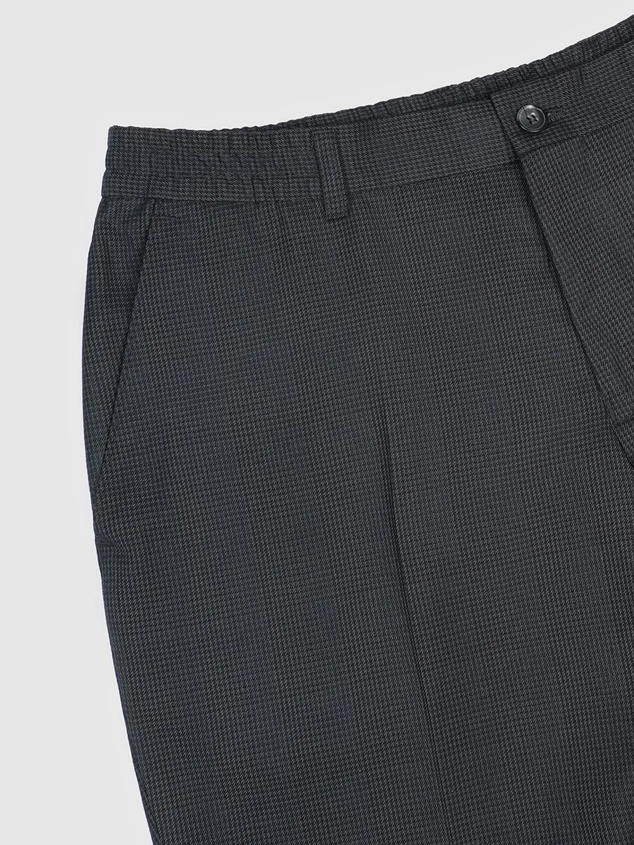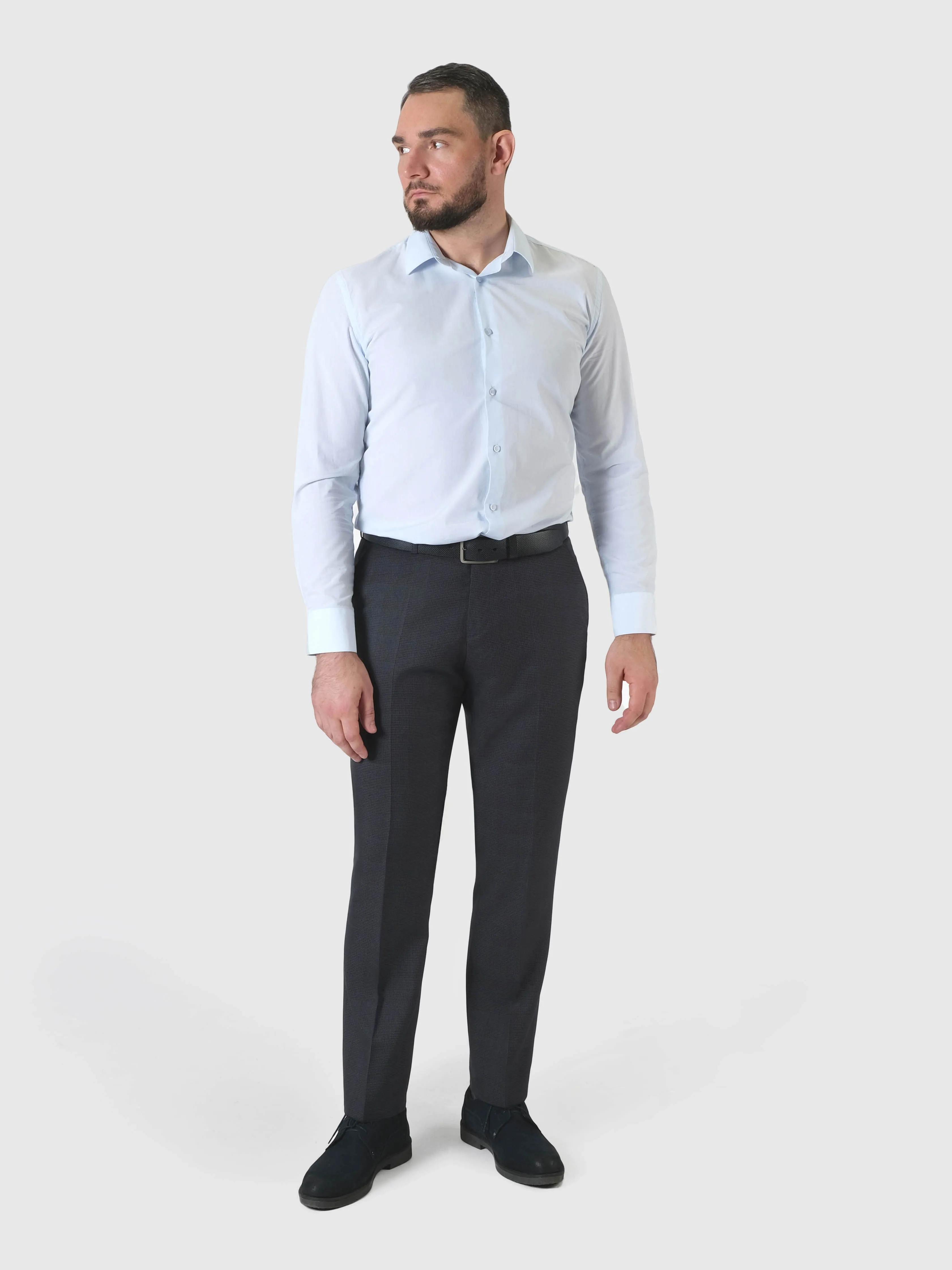 Мужские брюки Peplos прямого кроя темно-серого цвета соответсвуют классическому стилю - боковые карманы с отрезными бочками, один задний карман в рамку, подклад, застежка на молнию, крючок и пуговицу. Изделие сшито на итальянский лад - штанины заканчиваются у задника обуви, слегка оголяя щиколотку при ходьбе. Брюки исполнены из мягкого и прочного материала, износостойкого и комфортный в носке. На темно-серой ткани есть рисунок в виде клетки, которая придает брюкам оригинальный и стильный вид. Рисунок неконтрастный, приятно выделяет стильный образ, при этом позволяет носить данные брюки на официальные и деловые встречи.