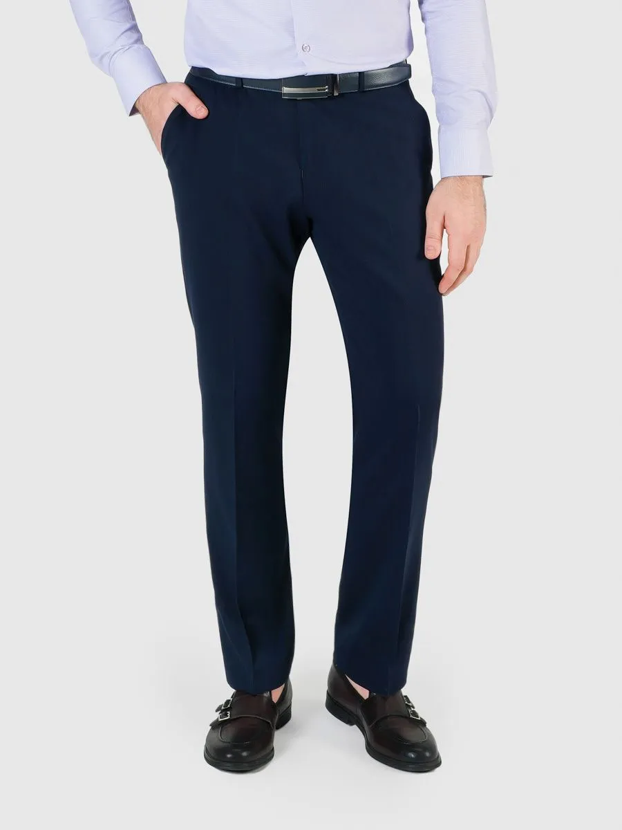 Мужские брюки прямого силуэта в темно-синем оттенке. Прямой силуэт это неизменная классика, которая подходит для официальных мероприятий и деловых встреч. Брюки оснащены удобным поясом на резинке, который обеспечивает оптимальную посадку и максимальное удобство во время носки. В то же время на поясе есть шлевки для ремня, что позволяет дополнять образ подходящими аксессуарами. Материал брюк имеет текстурный рисунок за счет переплетения однотонных нитей и придает изделию роскошный вид.Великолепный выбор для любых повседневных или деловых событий, эти брюки идеально сочетаются с сорочками и классическими пиджаками. Они подчеркнут вашу индивидуальность и придадут вашему образу неповторимый шарм.