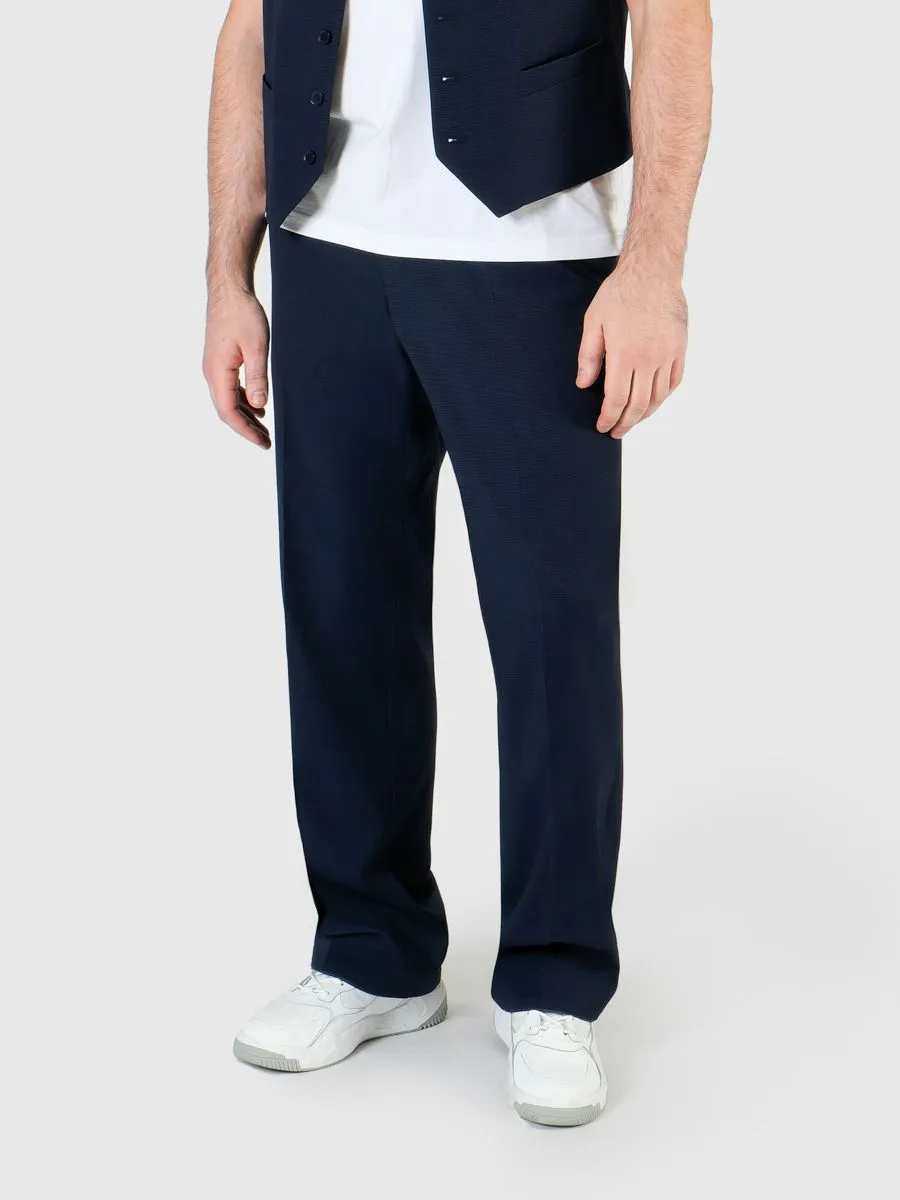 Широкие темно-синие брюки - хит сезона. Универсальный цвет и классический широкий силуэт делает эти брюки базовыми в гардеробе современного мужчины, а резинка на поясе создает комфорт при носке. Брюки можно носить с кроссовками или ботинками на толстой подошве, сочетать с сорочками или футболками. Можно создать ультрамодный образ с жилетом V24015-004 и футболкой TS24103-R Peplos.