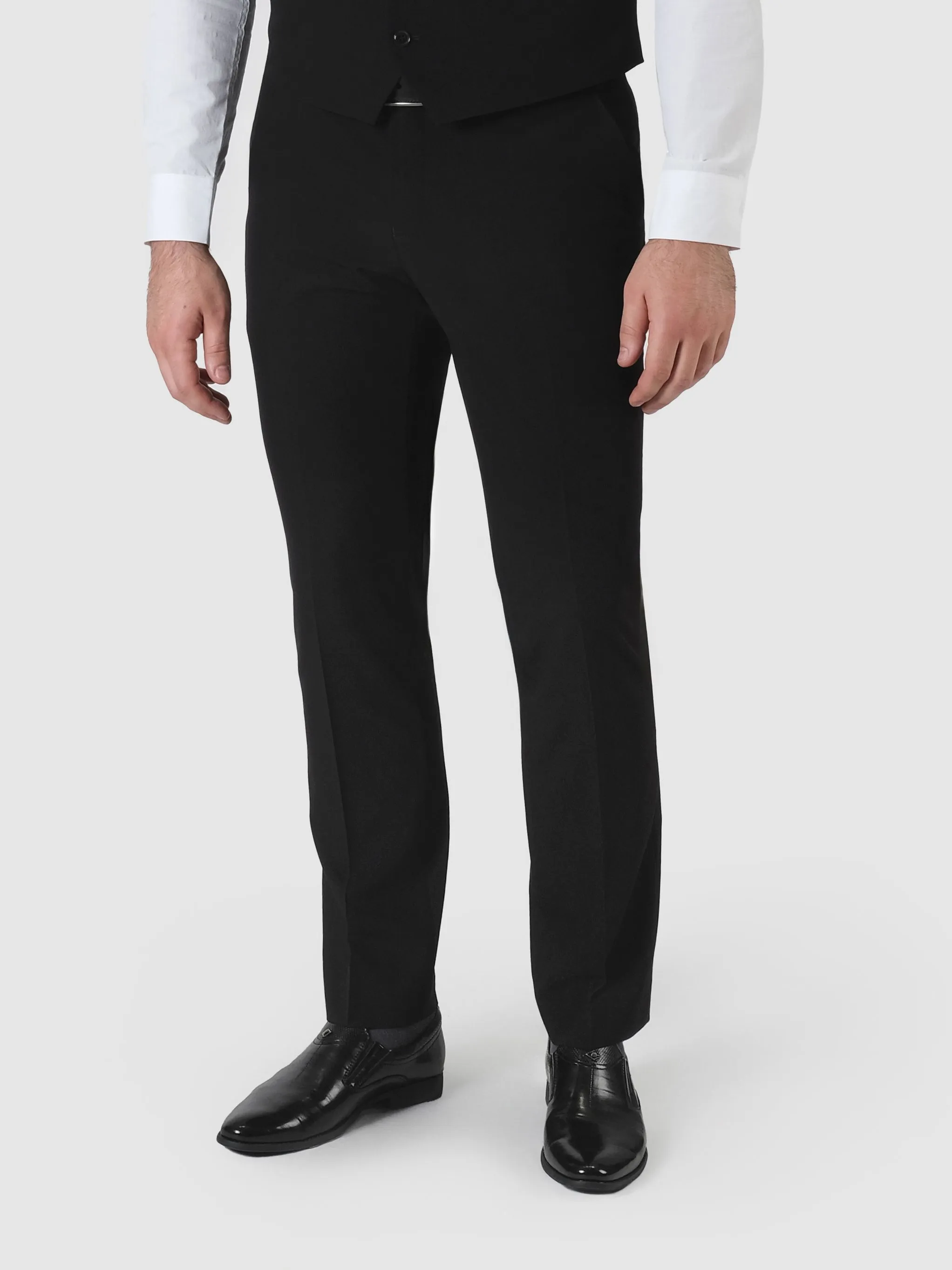 Классические брюки черного цвета - незаменимая классика в гардеробе делового мужчины. Брюки Peplos выполнены из ткани на основе полиэстера и вискозы, что делает вещь долговечной и практичной. Материал хорошо отводит влагу и позволяет телу "дышать". Модель имеет зауженный силуэт, на брюках есть два кармана с отрезными бочками и задний карман в рамку. Стильный образ можно создать в комбинации с черным жилетом V24099-002.