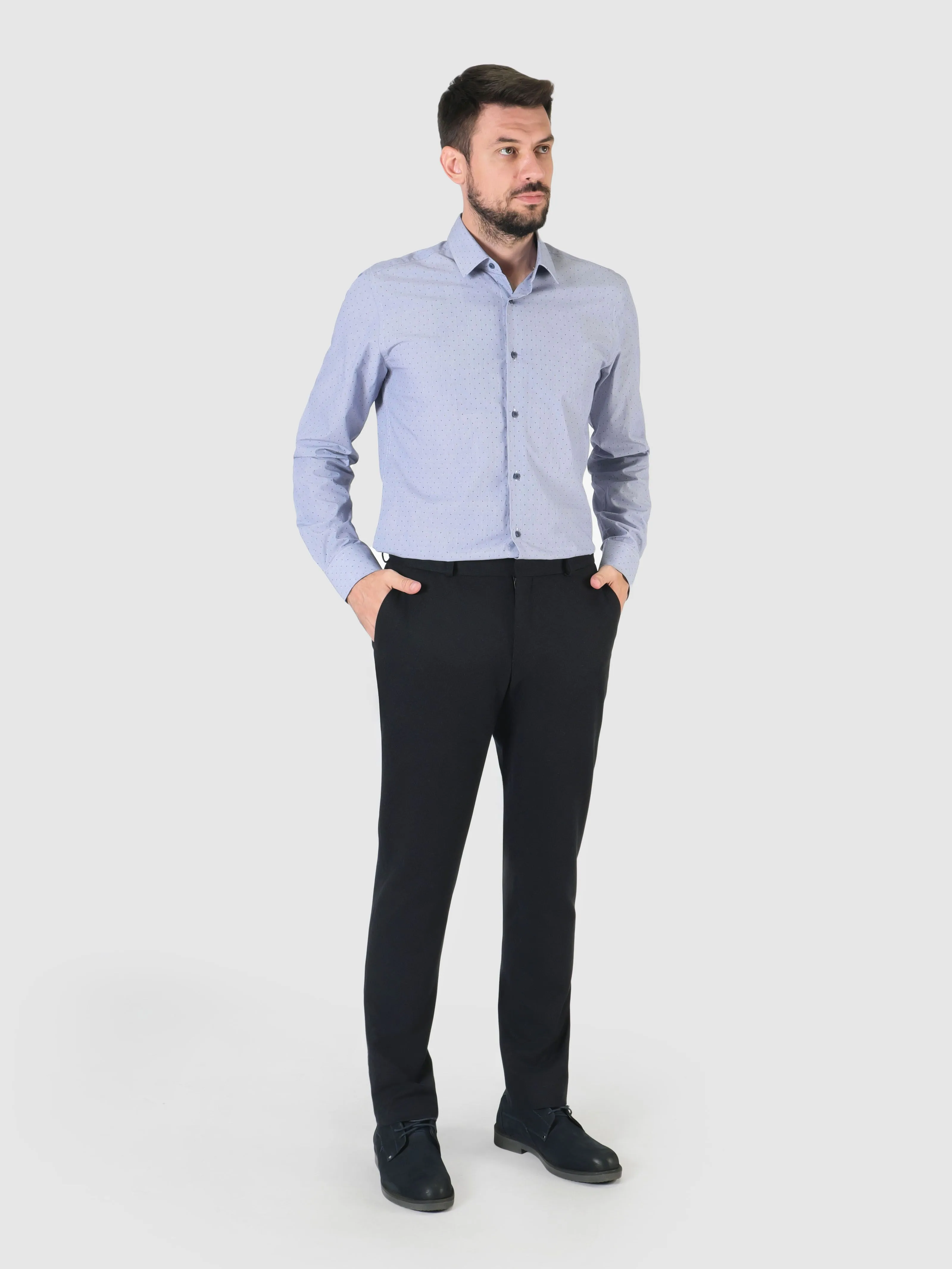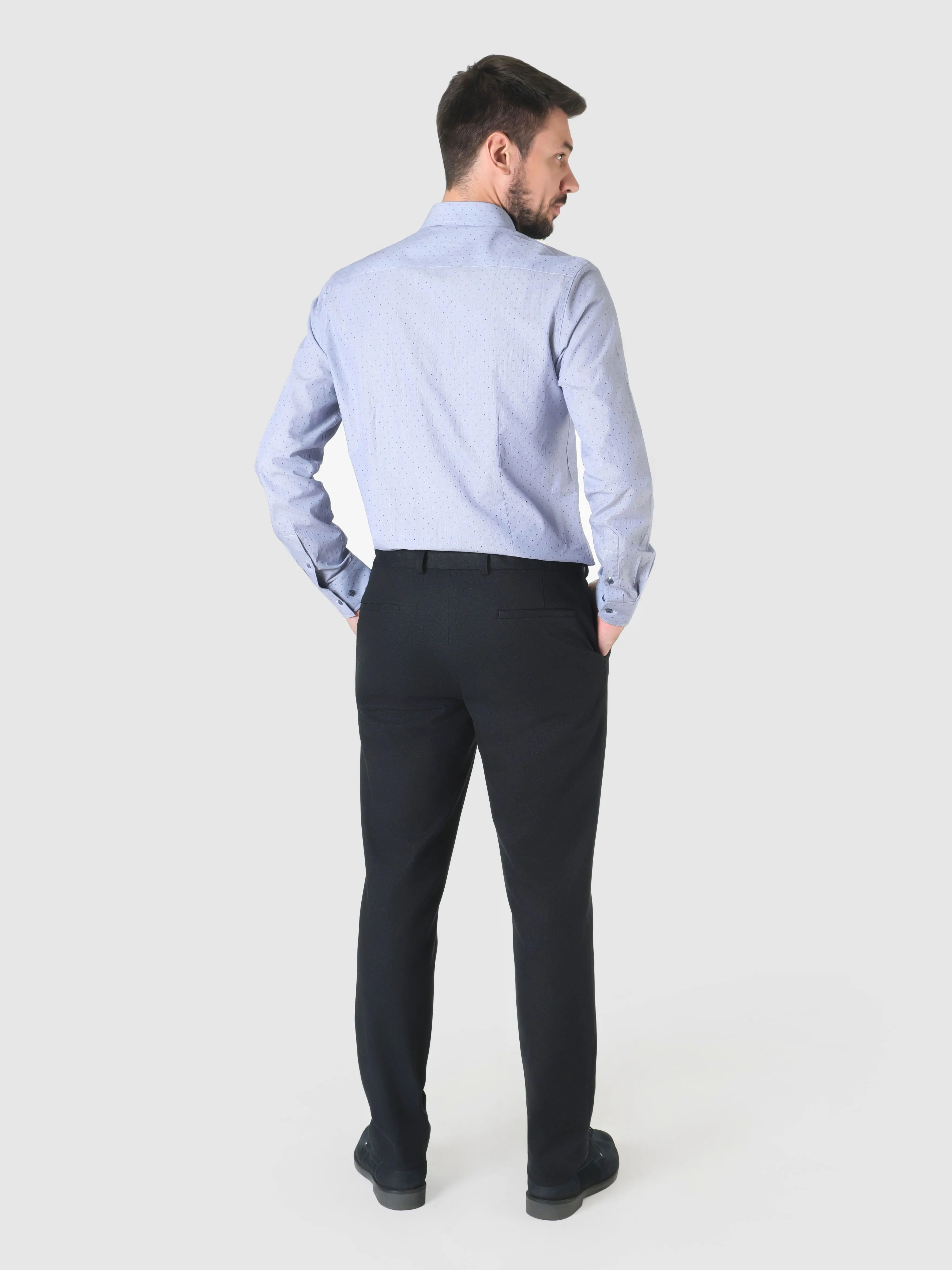 Мужские брюки Peplos черного цвета подойдут стройным и высоким мужчинам. Модель брюк заужена к низу, плотно облегает ногу в области голени. Ткань мягкая и плотная, что делает данные брюки очень теплыми. Пояс на изделии изготовлени со вставкой резинки, что дает удобство и комфорт при носке брюк, но при этом сохранены и шлевки для ремня. Мелкий рисуннок на ткани в виде клетки придает брюкам изысканный вид. Застежка сделана на молнии, есть крючок. Брюки можно отлично сочетать с сорочкой и приталенным пиджаком или же с водолазкой.