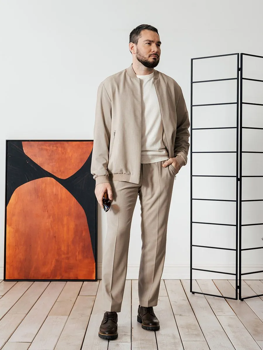 Мужские брюки изготовлены из легкого материала бежевого оттенка, очень подходящего для теплого времени года. Прямой силуэт и резинка на талии – модель, созданная для тех, кто ценит комфорт и стиль в жаркое время года. А приятный бежевый цвет добавляет классическую нотку к образу и позволяет легко сочетать брюки с другими элементами одежды. Удобство и практичность – вот главные качества этих брюк. Они имеют удобную посадку и прямой крой, который подходит практически для любой фигуры. Боковые карманы обеспечивают удобное хранение мелочей, а шлевки для ремня на поясе позволяют добавить подходящий под образ ремень и сделать образ более строгим и классическим. Особенностью этих брюк является их многофункциональность. Вы можете носить их как с джемперами, сорочками и поло, так и дополнить их пиджаком-бомбером, изготовленным из такой же костюмной ткани JA24127-B. В сочетании с пиджаком получится единый и гармоничный силуэт, олицетворяющий утонченность и стиль.