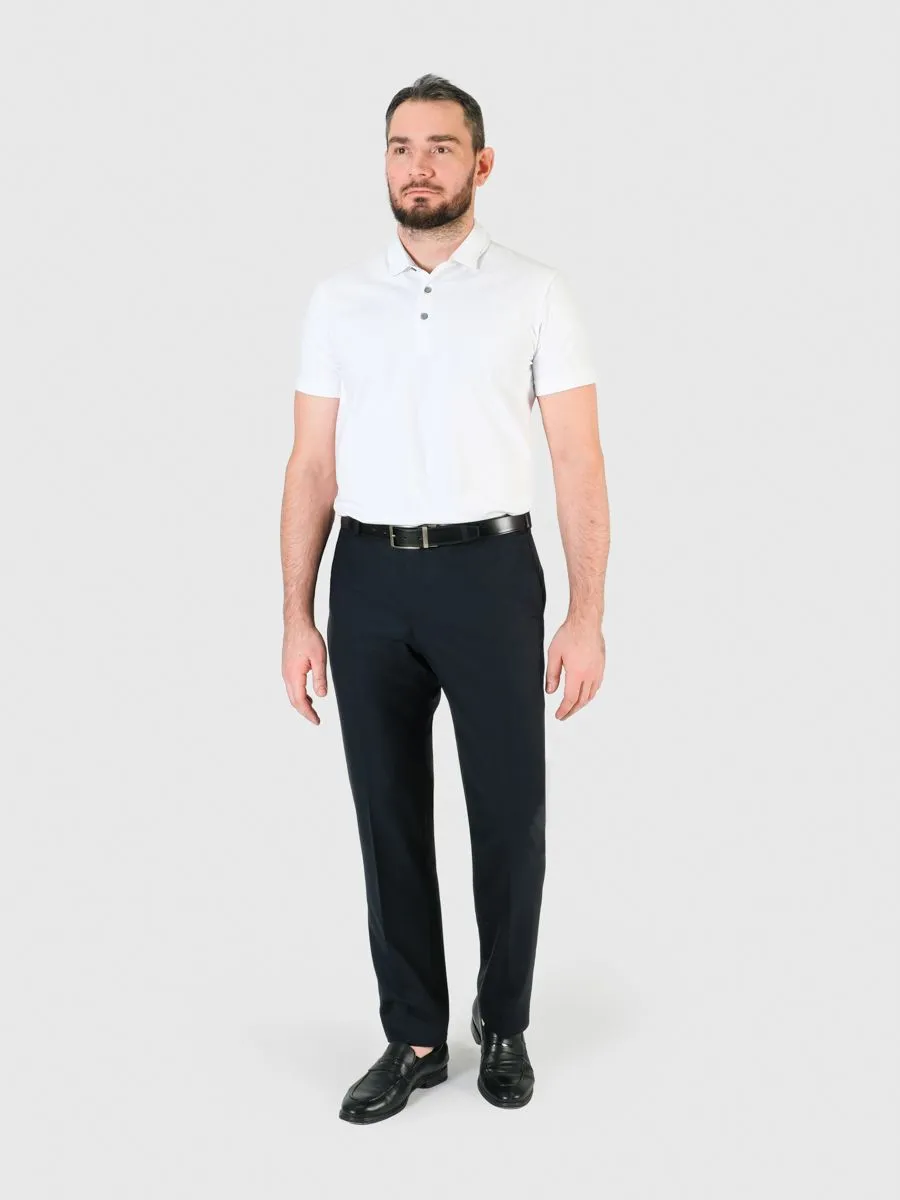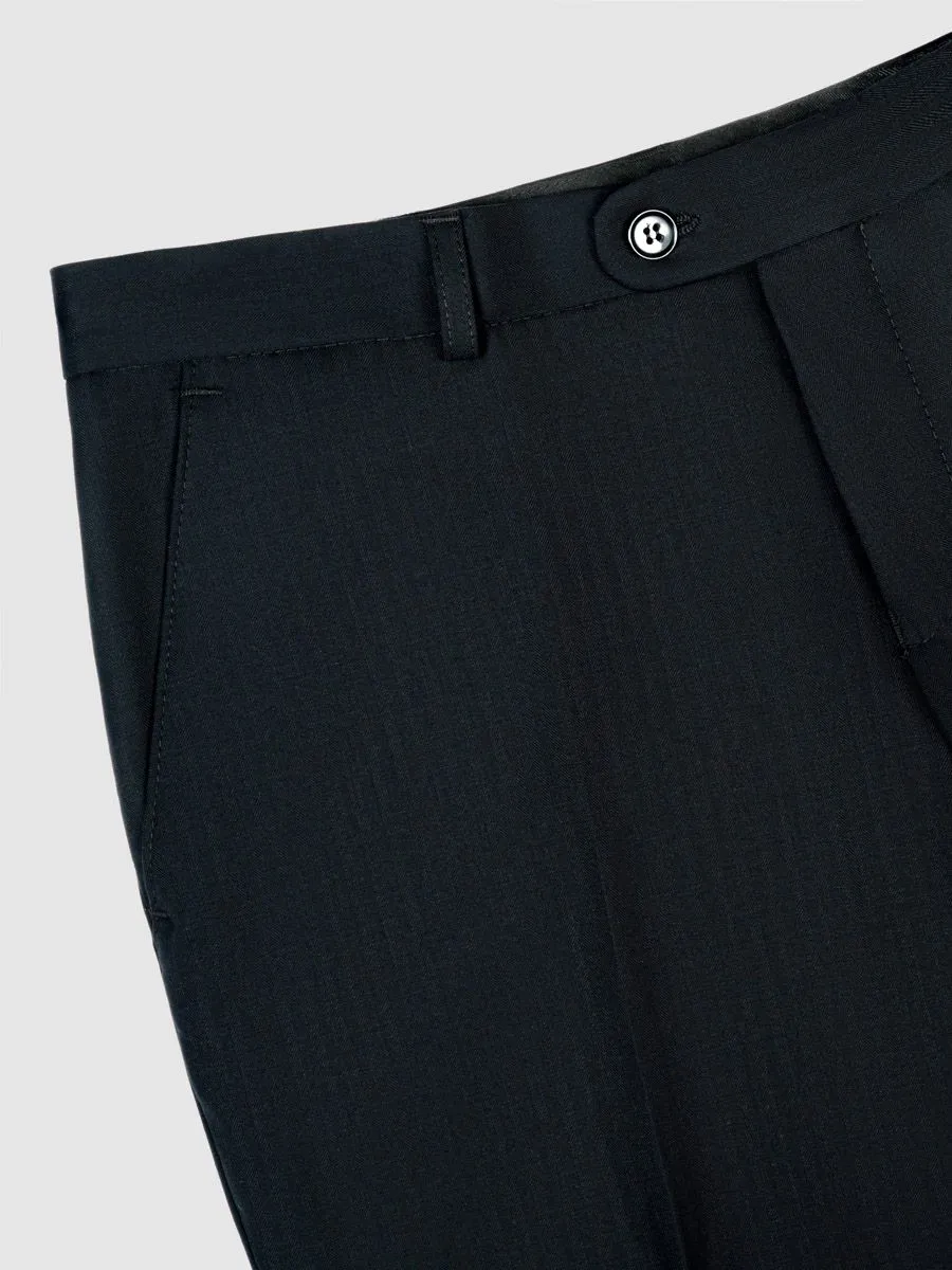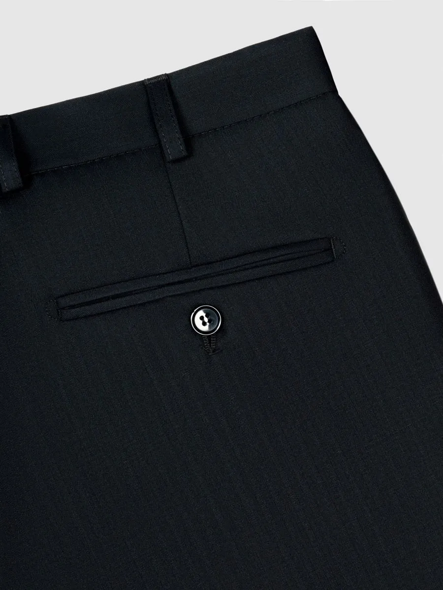 Классические брюки черного цвета с прямым силуэтом и интересным рисунком в виде полосок в тон ткани. Такие брюки будут прекрасно смотреться как на вечеринке, так и на официальном мероприятии. Брюки изготовлены из высококачественного материала: 70% шерсти, 5% шелка и 5% кашемира. Матириал легкий, приятный на ощупь и комфортный в носке. У брюк есть такие классические детали, как стрелки на брючинах, корсажная лента на поясе, два боковых кармана и один задний карман в рамку. Все эти детали придают брюкам элегантный и деловой вид. Брюки прекрасно сочетаются с поло, джемперами и классическими сорочками.