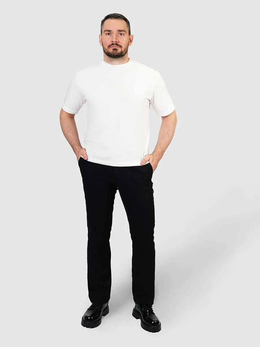 Черные однотонные мужские брюки – это символ сдержанной элегантности и практичности. Прямой силуэт обеспечивает свободу движений и универсальность, подходя как для деловых встреч, так и для неформальных мероприятий. Дополнительные 2 сантиметра в талии гарантирует комфортную посадку, что особенно важно для мужчин, ценящих удобство превыше всего.Гладкая однотонная ткань придает брюкам утонченный вид. Отсутствие каких-либо рисунков или текстур делает их идеальным фоном для экспериментов с другими элементами одежды. Они прекрасно сочетаются с рубашками разных цветов и стилей, от классических белых до ярких клетчатых. Также легко дополняются пиджаками, свитерами и даже футболками, создавая множество различных образов.