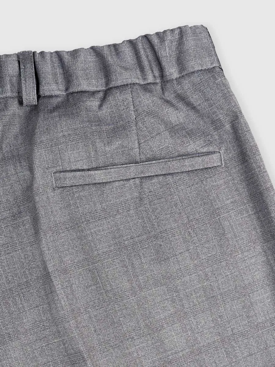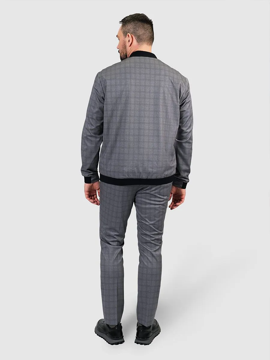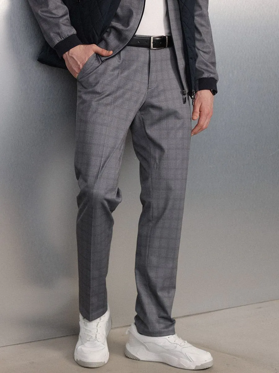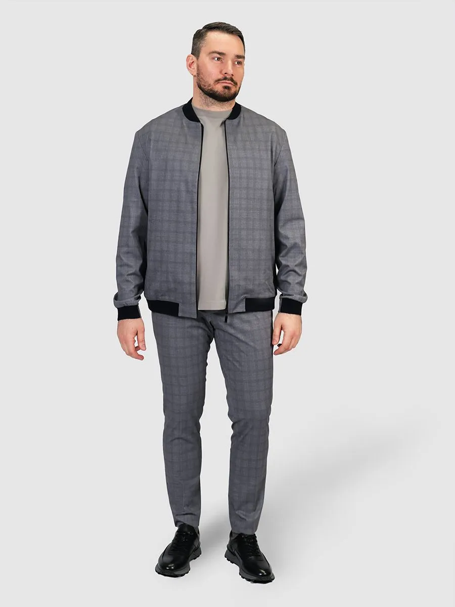 Зауженные брюки в серую клетку. К брюкам можно приобрести в комплект бомбер BM52105. Ткань, из которой изготовлены брюки, светлая немаркая. В ее составе много нейлона, благодаря чему брюки не мнутся, быстро сохнут и обладают высокой износостойкостью.