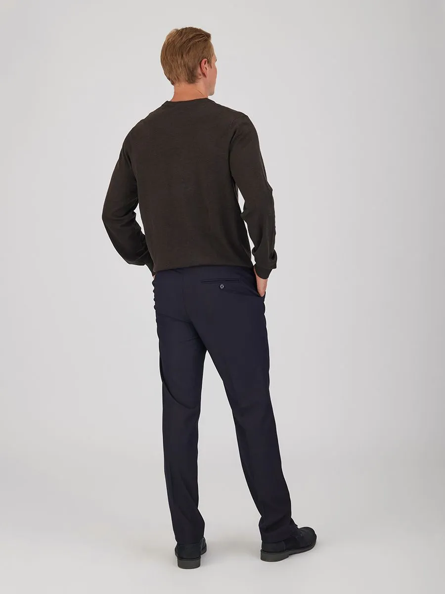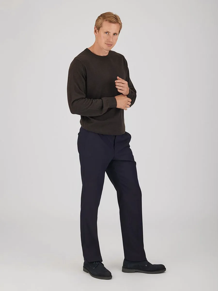 Мужские темно-синие брюки из базовой коллекции. Безупречные стрелки и прямой силуэт создают строгий, но в то же время современный образ. Завышенная посадка по задней слонке, дополнительные 2 см в талии и пояс на корсажной ленте гарантируют идеальную посадку и непревзойденный комфорт в течение всего дня.