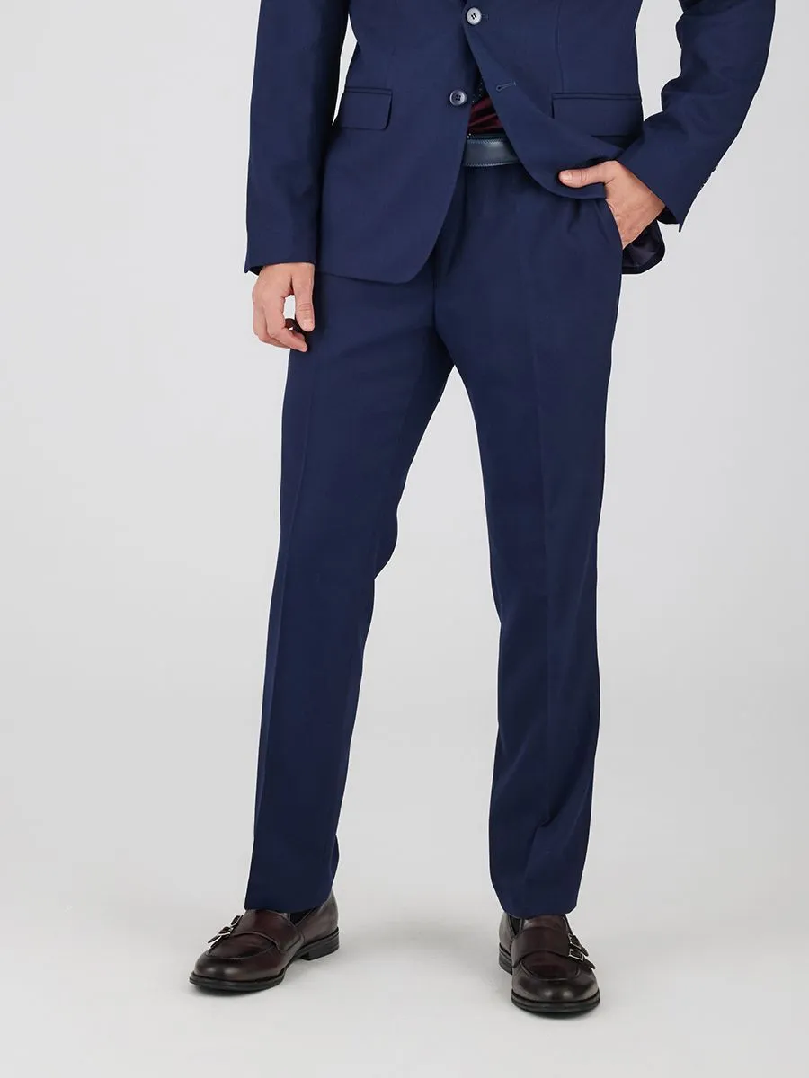 Мужские брюки, воплощающие в себе изысканную элегантность и современный комфорт. Фактурная темно-синяя ткань придает им глубину и благородство, а зауженный к низу силуэт подчеркивает стройность фигуры. Классические стрелки добавляют строгости и делового шарма. Подкладка обеспечивает приятное ощущение при носке, а пояс на корсажной ленте гарантирует идеальную посадку и безупречный внешний вид.