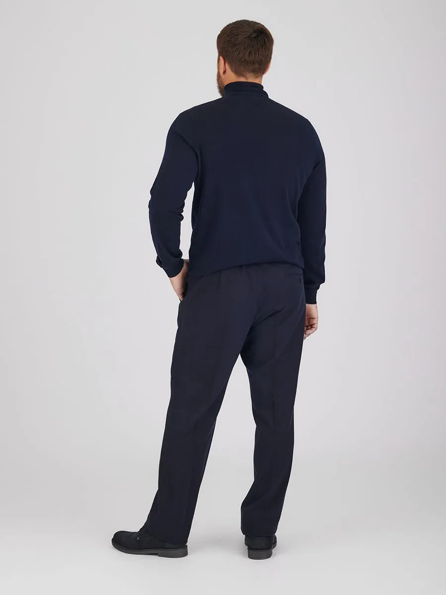 Мужские брюки, выполненные из плотной «а-ля драповой» тканиткани насыщенного темно-синего цвета, станут незаменимым элементом гардероба в холодное время года. Эта модель разработана с учетом особенностей полной фигуры, предлагая дополнительный комфорт благодаря увеличенному объему в талии +2 см. Пояс на корсаже обеспечивает оптимальную фиксацию и удобство ношения.