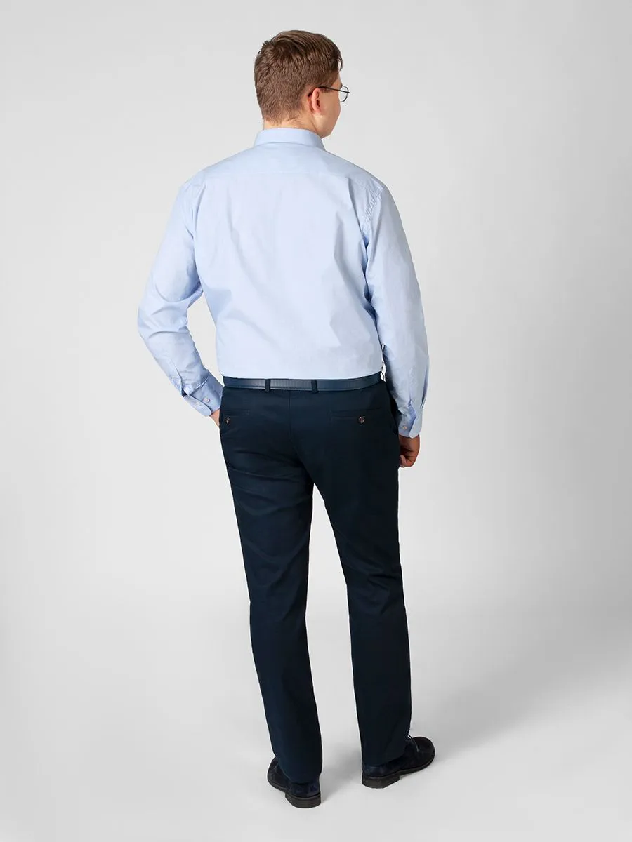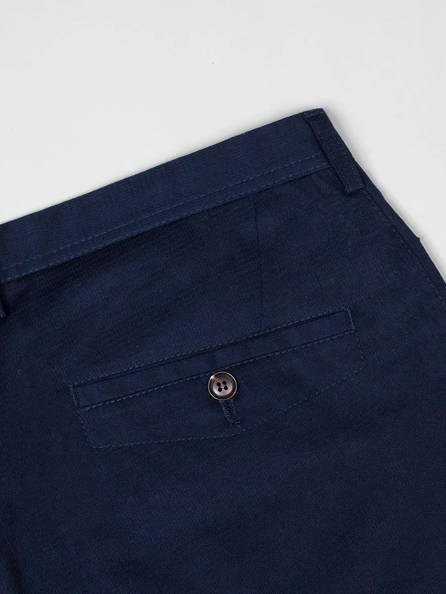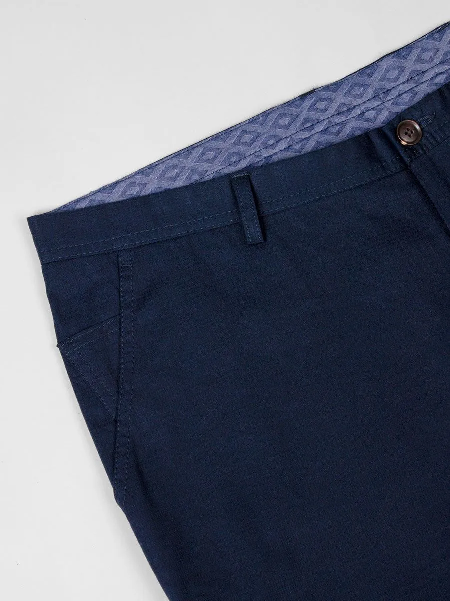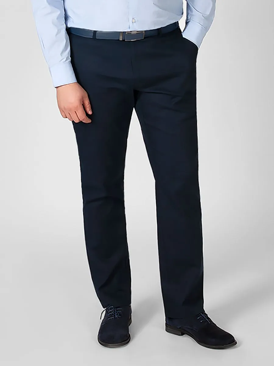 Универсальные хлопковые брюки Peplos в стиле Casual из ткани с мелкой фактурой темно-синего цвета могут стать отличной основой мужского гардероба. Внутренние отделки из хлопка с геометрическим принтом и стильные удобные карманы по бокам хорошо дополняют брюки. Задние карманы сшиты с листочкой и декоративной строчкой, по форме напоминающей клапан. Данная модель имеет умеренно узкую ширину брюк внизу.