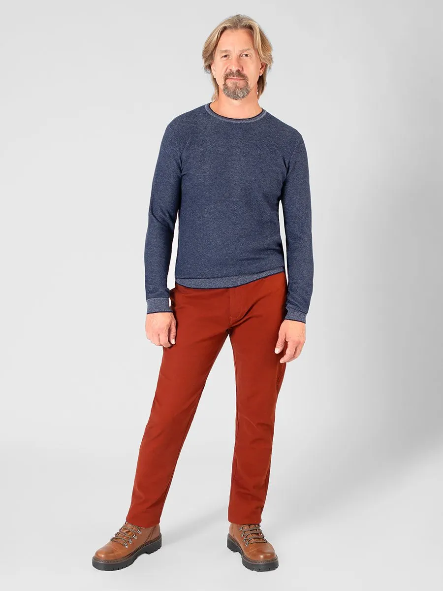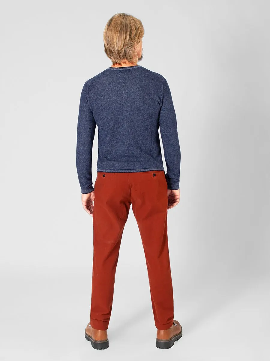 Мужские терракотовые брюки Peplos - тренд осени 2021. Силуэт изделия Slim Fit - самый популярный на сегодняшний день тип посадки. Зауженный крой, облегающие по всей длине ног, «по фигуре». В комплекте присутствует мужской синий джемпер KN22J015. Удобная куртка OW2213 в стиле минимализм в сочетании с терракотовыми брюками casual - беспроигрышный вариант для повседневного образа.