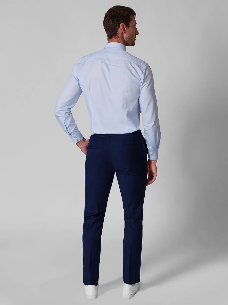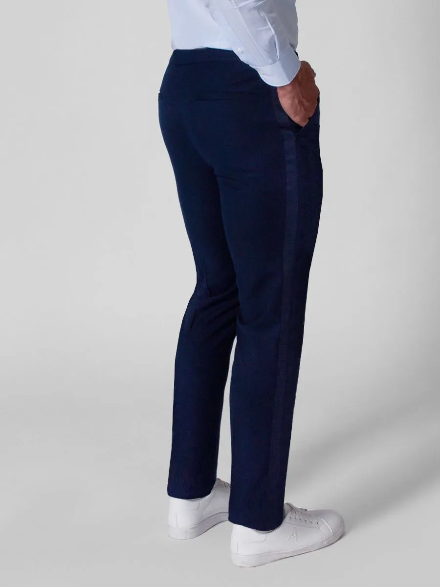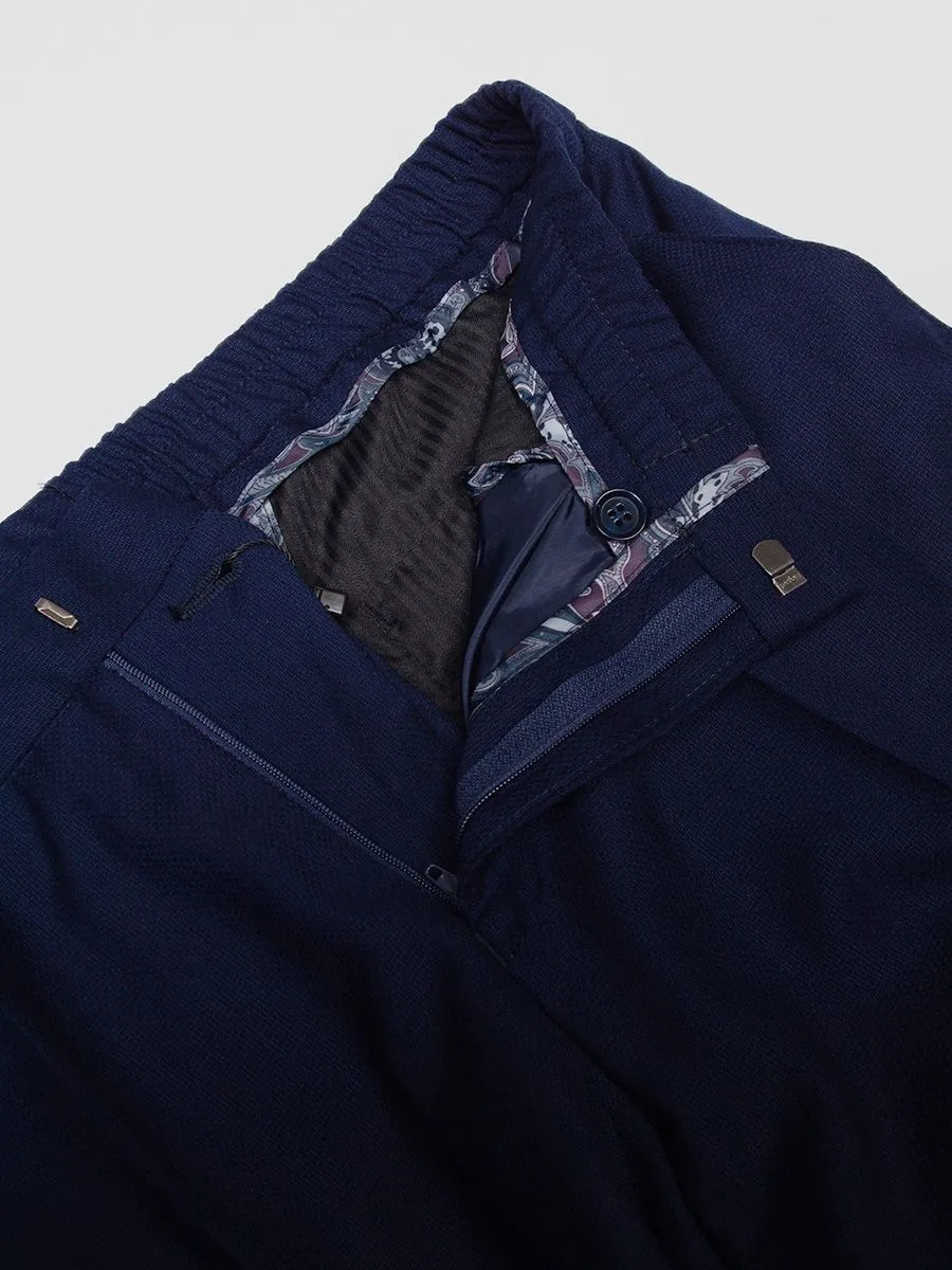 Считается, что классический стиль в одежде не предполагает наличие каких-либо декоративных элементов. В последние несколько сезонов таким своеобразным элементом фьюжена являются брюки с лампасами. Офисный дресс-код, а также дресс-код официальных мероприятий и деловых встреч предусматривает элегантный и сдержанный вид. Темно-синий двубортный пиджак JA20032-SL и брюки с полоской в тон станут идеальным модным решением. Данная модель брюк на резинке позволяет отказаться от ремня и подтяжек, делая брюки более практичными. Их также можно сочетать не только с деловой, но и спортивной обувью, например, белыми кедами.