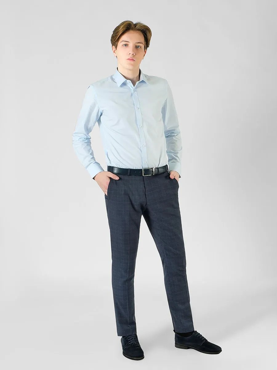 Данные брюки Peplos созданы для тех, кто хочет разнообразить свой классический гардероб однотонных брюк. Именно ткань и ее расцветка в первую очередь привлекают внимание. Сложный серый цвет с синим подтоном разбавлен неконтрастной клеткой. Сама клетка образована пересечением голубых, серых, черных и даже бордовых нитей, но последние видно только при очень детальном рассмотрении. Такой рисунок позволяет создавать и менее классические образы с другим верхом и обувью.