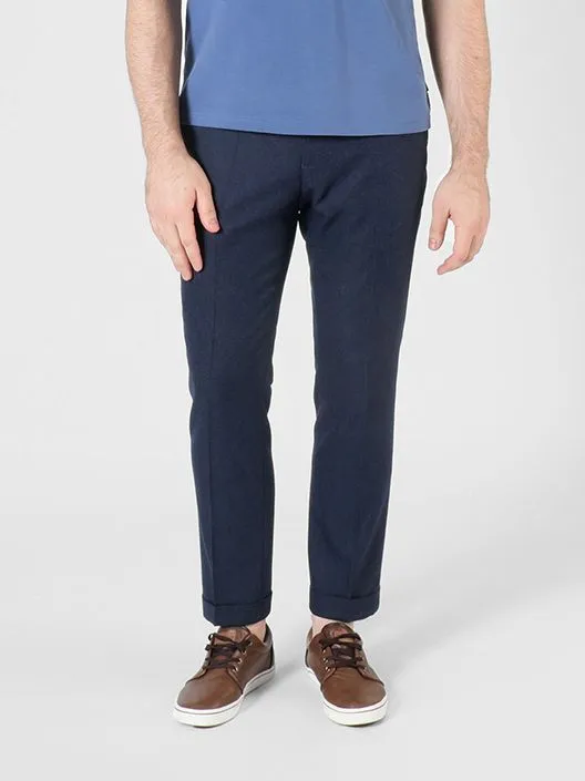 Мужские брюки темно-синего цвета являются прекрасным выбором для стильного и модного мужчины. Этот классический предмет гардероба способен подчеркнуть силу и элегантность мужской фигуры, придавая образу изысканность и безупречность. Зауженный силуэт брюк добавляет современности, а наличие внизу штанин манжет вности актуальности в образ. Ткань, из которой изготовлены брюки, имеет микродизайн, который создает текстурность, а универсальный темно-синий оттенок придает изделию элегантность и изысканность. Такие брюки идеально подходят как для носки с классическими сорочками и пиджаками, так с футблками поло, что позволяет создавать множество стильных образов.