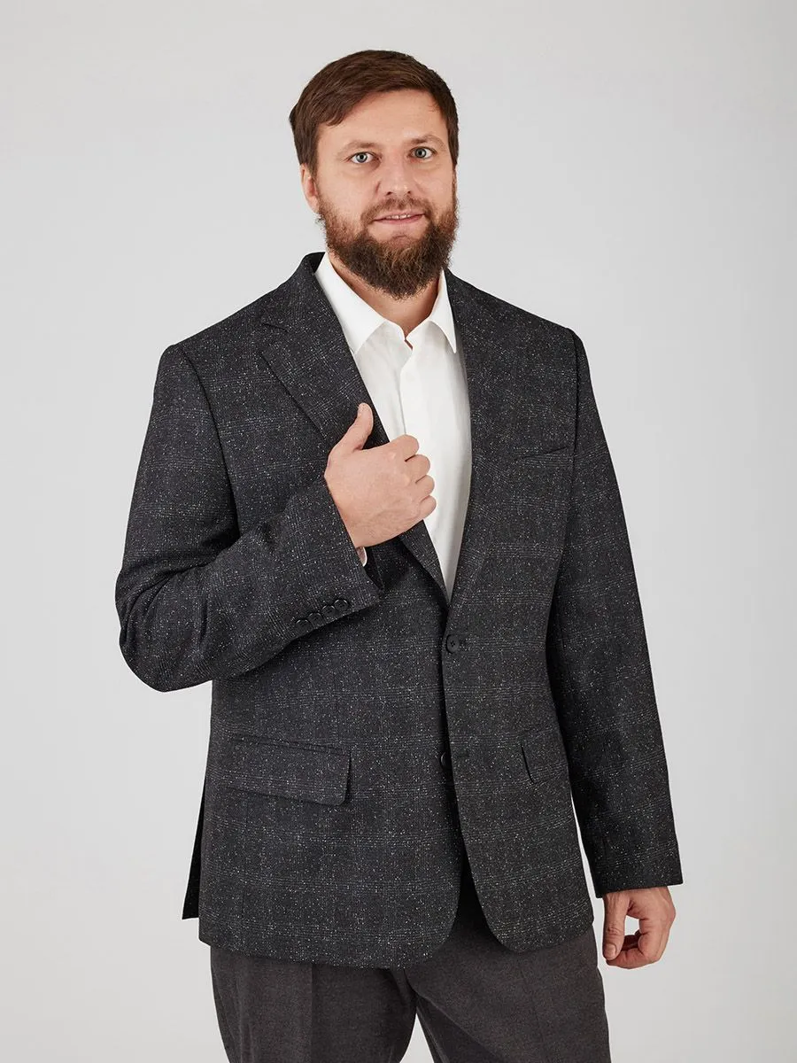 Модный вариант черного пиджака для торжественных случаев в прямом силуэте. Вкрапления белых нитей создает эффект мелкой мозаики на поверхности ткани.Ткань пиджака легкая, тонкая, что заметно облегчает вес пиджака.