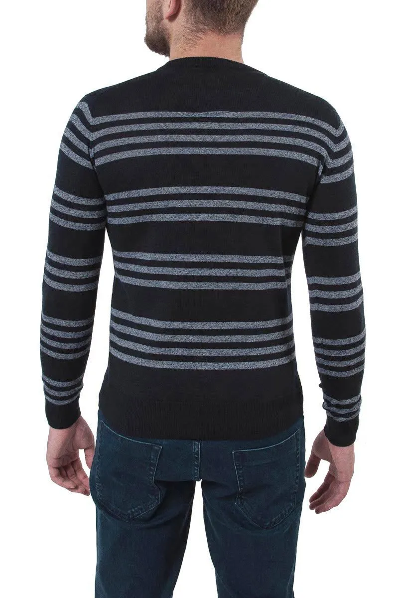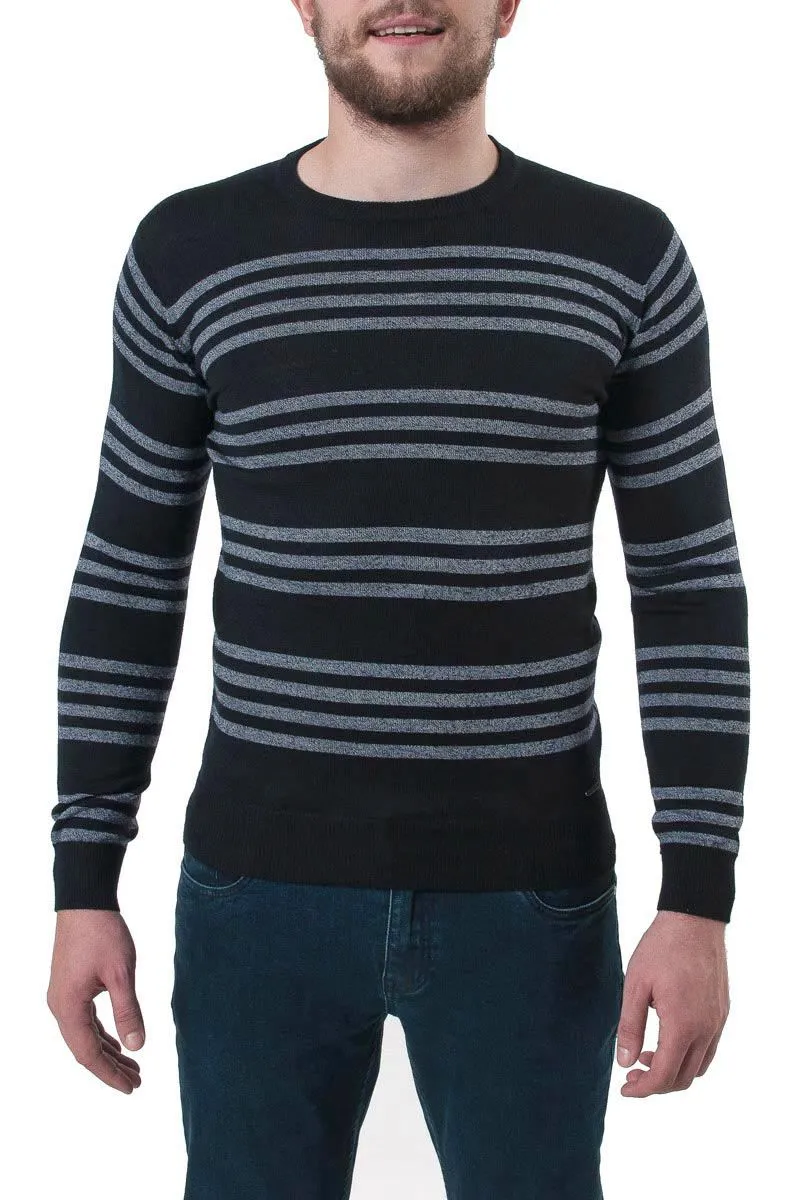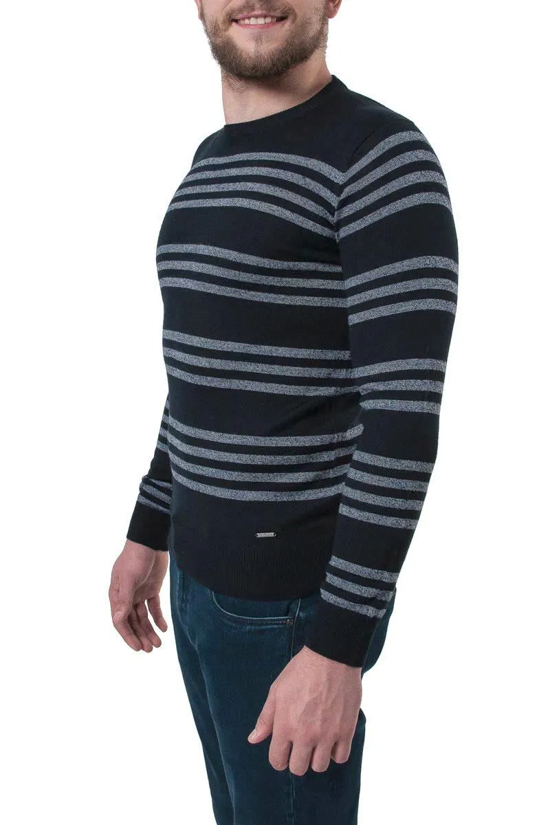 Темно-синий полушерстяной джемпер, с круглым вырезом горловины, в серую полоску. Низ и манжеты дополнены резинкой во избежания преждевременного вытягивания ткани.
