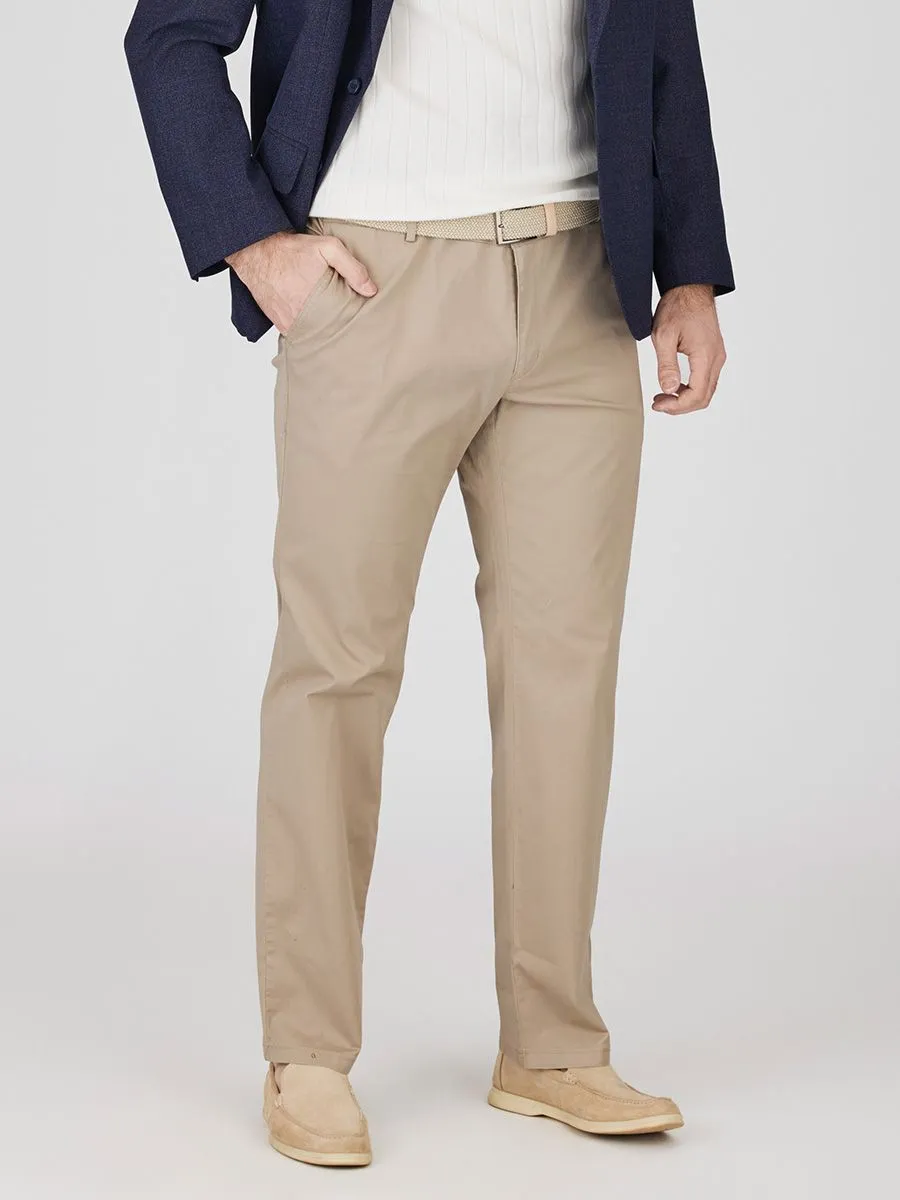 Бежевые мужские брюки, специально созданные для размерной линейки плюс сайз, сочетают в себе комфорт, продуманный крой и сдержанную стилистику. Их отличает свободная посадка в области бедер, обеспечивающая полную свободу движений, и аккуратный силуэт, плавно зауженный к низу для современного вида. Пояс без корсажа гарантирует удобную посадку, а два задних кармана, оформленных классической листочкой, добавляют модели практичности и завершенности. Высококачественный состав из 97% натурального хлопка и 3% эластана дарит брюкам мягкость, воздухопроницаемость и необходимую эластичность, что обеспечивает идеальную посадку и комфорт в течение всего дня. Эта модель станет надежным и универсальным базовым элементом гардероба, где эстетика и удобство находятся в совершенном балансе.