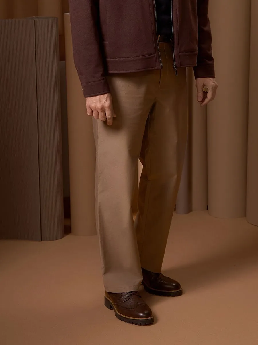 Мужские брюки модели «Бананы» в бежевом цвете представляют актуальный силуэт с характерным кроем: широкие в верхней части, они плавно заужаются к низу, создавая динамичный и современный образ. Высокая посадка и пояс без корсажа обеспечивают комфорт и уверенную фиксацию, а два задних кармана с классической листочкой добавляют практичности и завершенности дизайну.Исключительный комфорт этих брюков обусловлен составом ткани. Комбинация из 76% хлопка, 22% модала и 2% спандекса создает материал, который идеально адаптируется к движению. Хлопок и модал обеспечивают натуральную мягкость, гигроскопичность и воздухопроницаемость, а небольшая добавка эластана гарантирует брюкам необходимую эластичность для безупречной посадки и сохранения формы.Эта модель станет универсальным элементом гардероба, удачно сочетая в себе тенденцию к объемным силуэтам, повседневный комфорт и нейтральную цветовую гамму для множества стилевых комбинаций.