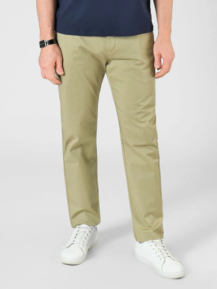 Светлые бежевые брюки будут актуальны в демисезон и особенно летом. Такой цвет меньше пропускает солнечные лучи, а хлопковый состав обеспечивает воздухопроницаемость. Если присмотреться, то можно увидеть микродизайн в виде более темных точек, который придает брюкам интересный подтон. Брюки рассчитаны на рост 176-186 в зависимости от пропорций тела.