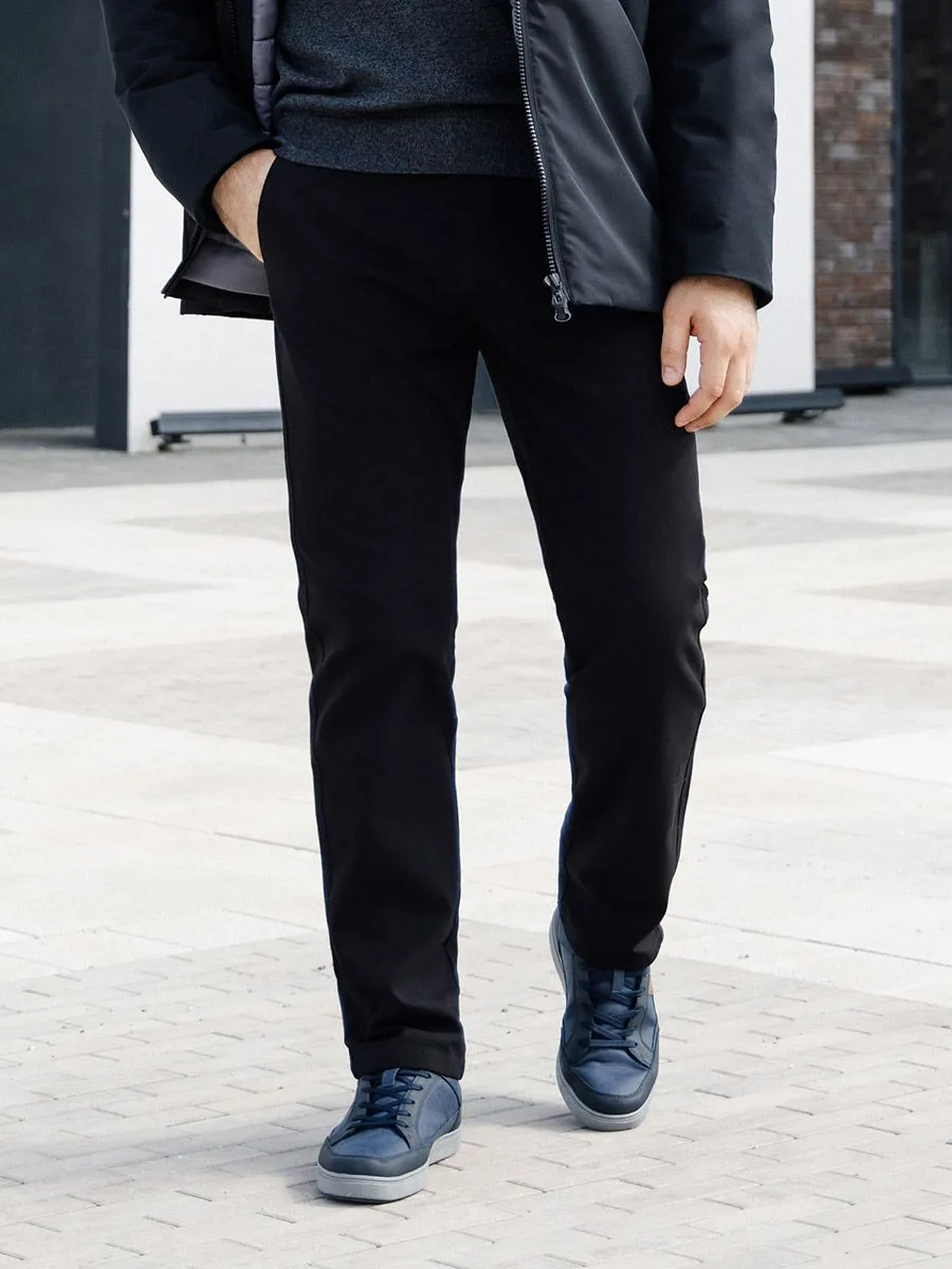 Брюки Casual в черном цвете практичный и стильный вариант для ежедневной носки. Дышащий и эластичный состав также обеспечивает удобство носки. Брюки имеют комфортную посадку, и лишь слегка заужаются к низу. У брюк удобные боковые карманы и два задних кармана в рамку. Брюки послужат базой любого гардероба, с которыми можно составить множество образов.