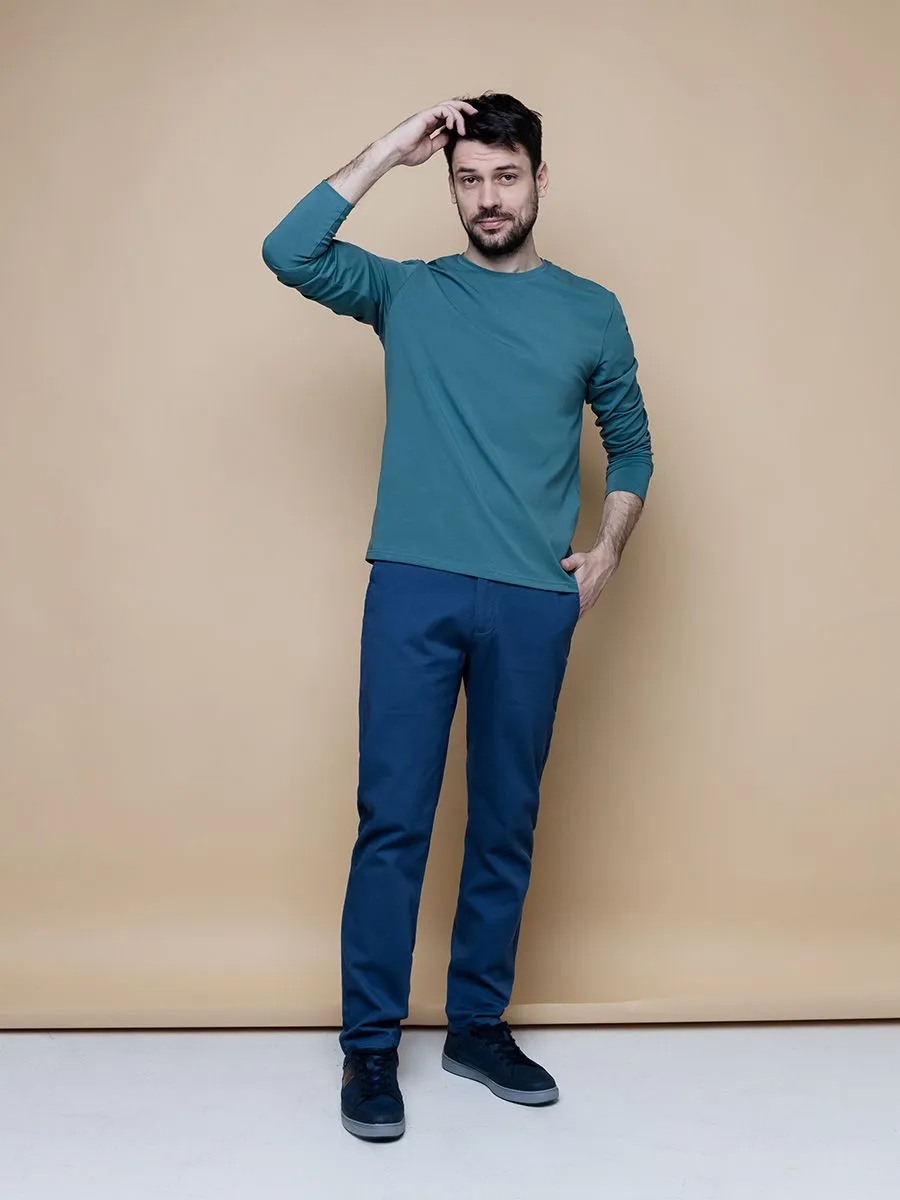 Лонгслив притягательного зеленого оттенка разнообразит гардероб мужчины и сделает образы более интересными. Его можно комбинировать с футболками, пиджаками, жилетами и каждый раз получать новый образ. Его простой крой и прямой силуэт полностью соответствует последним тенденциям минимализма и лаконичности. Высококачественный хлопок хорошо держит форму, чему также способствует добавленная в состав лайкра.