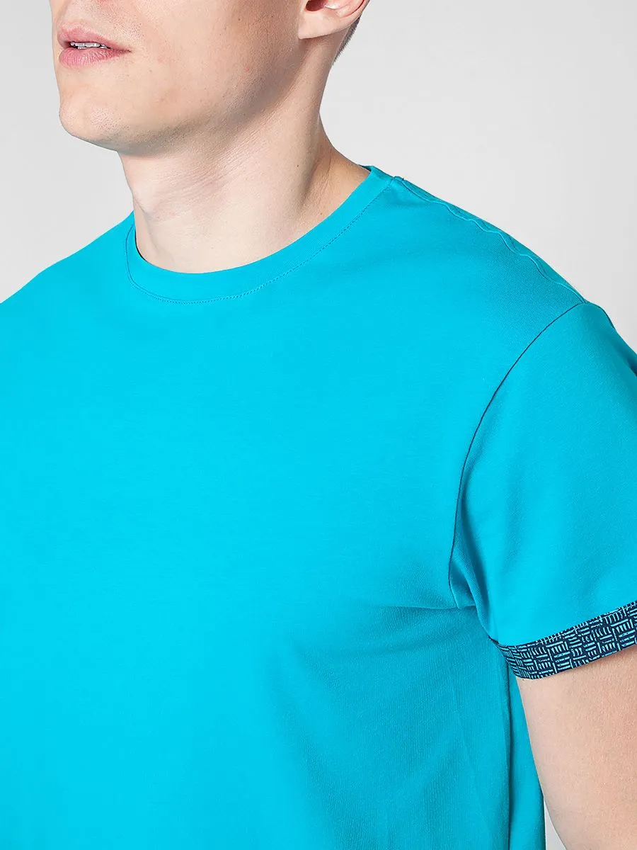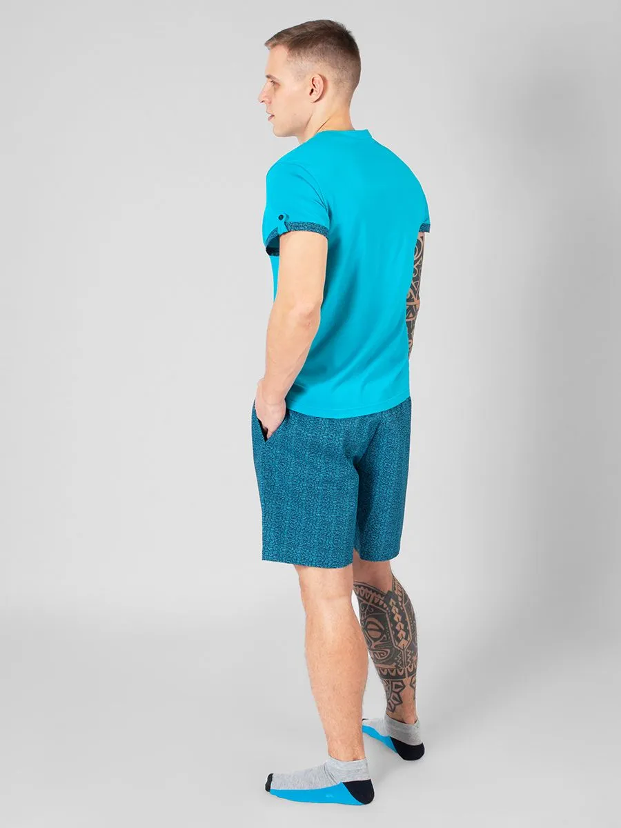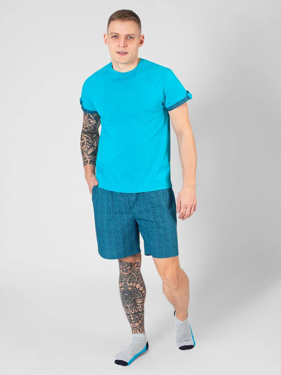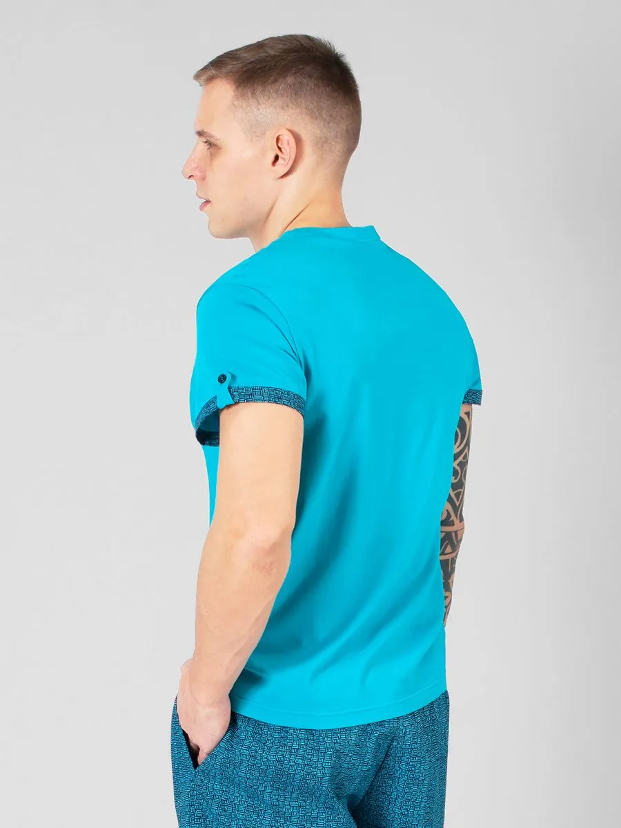 Футболка мужская выполнена в потрясающем голубом цвете с нотками бирюзового оттенка. При виде такой футболки сразу вспоминается песчаный пляж и лазурный берег моря. Возможно, именно на побережья моря она и будет смотреться гармоничней всего. Но при этом носка дома или на любом другом отдыхе также доставит вам удовольствие, ведь вы будете ощущать только мягкость, комфорт и свободу движений. Завершить образ можно такими же яркими шортами SS22003.