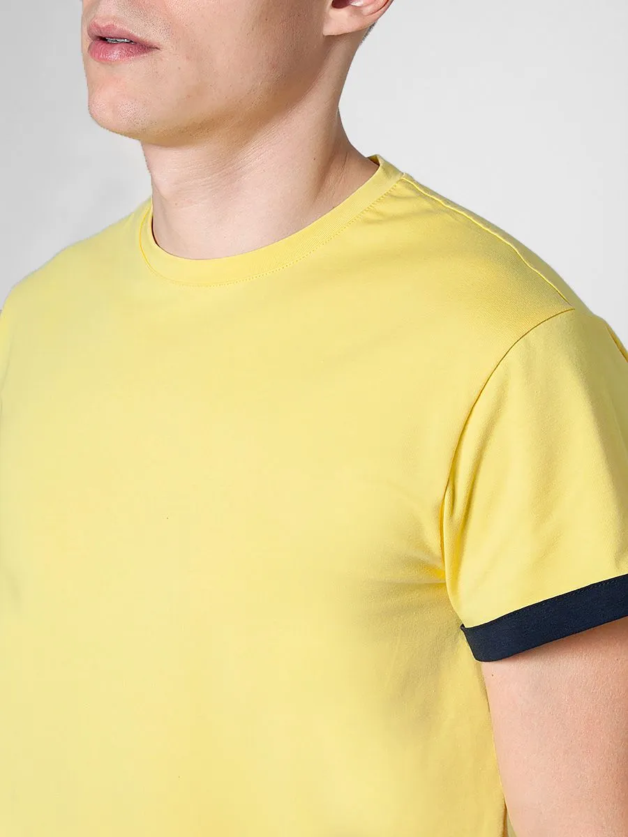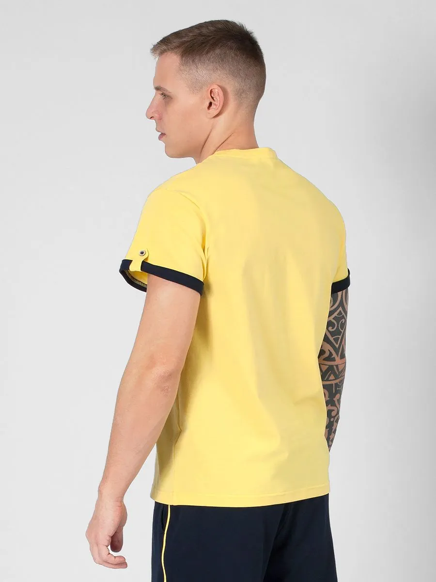 Мужская футболка желтого цвета станет ярким акцентом в гардеробе мужчины. Такой цвет заряжает энергией, бодростью и позитивным настроем. В этой футболке мужчина будет чувствовать себя абсолютно комфортно и уверенно. Такой комфорт обеспечивает высококачественный хлопок и небольшая доля эластан. Эластан наделяет футболку способностью хорошо держать форму, и при этом растягиваться и не сковывать движения. В комплекте с футболкой отлично будут смотреться шорты SS22005, которые имеют две вертикальные желтые полосы по бокам.